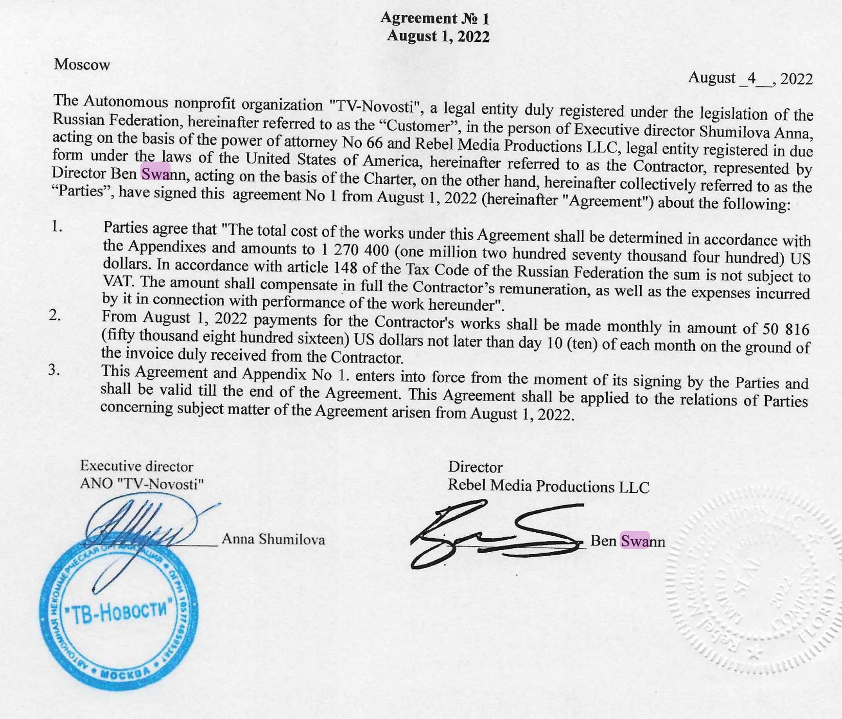 Появление же Суонна в «Вестях недели» далеко не случайно. Корреспондент Мельников представляет его как американского журналиста, но умалчивает, что Суонн еще и российский агент, точнее, директор компании-российского агента. И расписался в этом он сам, причем абсолютно добровольно.