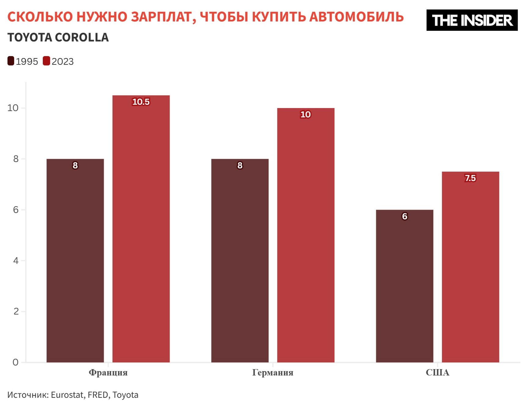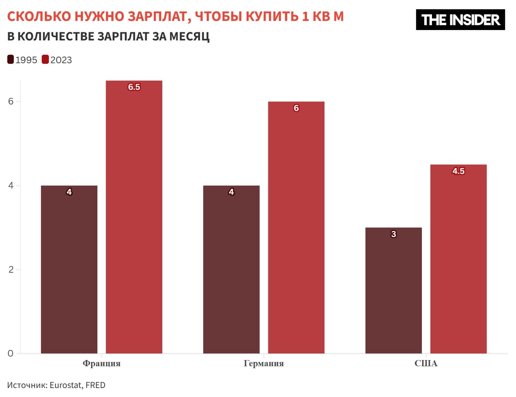Казалось бы, это значит, что люди должны в основной своей массе богатеть. Но парадоксальным образом и товары, и многие базовые услуги, и жилье за последние 20 лет стали в среднем менее доступными во всех трех странах. Даже в США, где рост зарплат особенно заметен, на автомобиль нужно потратить больше средних зарплат, чем 20 лет назад.