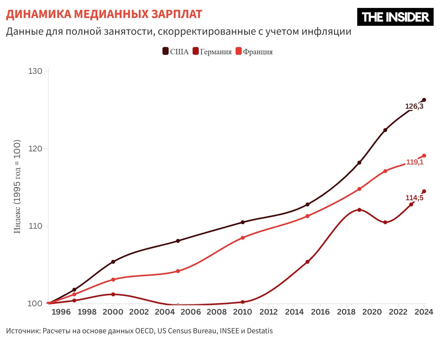В последние 30 лет номинальные зарплаты во всех трех странах росли. Средняя годовая зарплата в США в 1995 году составляла примерно $35 тысяч, в 2023 году — более $81 тысячи (рост около 130%). Во Франции за тот же период средняя номинальная зарплата выросла с 25 тысяч до 43,5 тысячи евро в год (на 57%). В Германии — с 42 тысяч до 48,3 тысячи евро (примерно на 15%). По реальному росту США также оказались лидером: там за последние 30 лет зарплаты выросли на 10–15%, в то время как в Германии и Франции — на 5–10% .