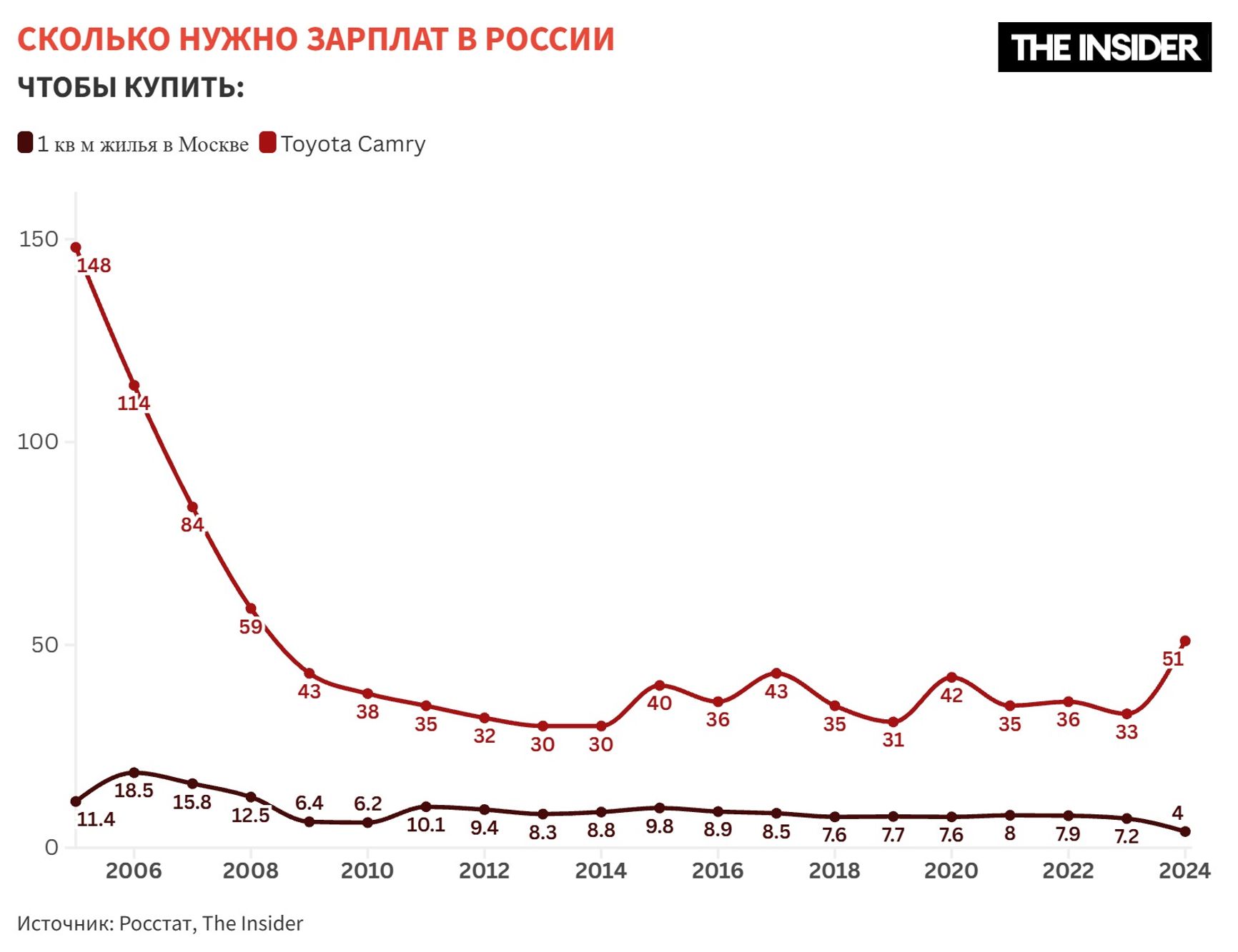 Если посмотреть на доступность конкретных товаров и услуг, то в начале нулевых жизнь российских граждан улучшилась, конечно, гораздо значительнее, чем у населения западных стран. Дело не только в ценах на нефть, но и в эффекте низкой базы: чисто арифметически (и психологически) рост от околонулевых значений выглядит гораздо значительнее, чем от уже высоких показателей. Но с конца нулевых годов эффект этого роста сходит на нет. Для России как показатель возьмем, например, Toyota Camry, чтобы увидеть как менялась доступность автомобилей среднего класса для россиян. Если в 2005 году требовалось 150 средних зарплат для покупки такого автомобиля, то к 2010 году — уже всего 38. С тех пор стоимость колебалась у этой цифры и лишь в последние пару лет снова резко пошла вверх: сегодня эта модель уже почти в два раза менее доступна, чем до полномасштабного вторжения.