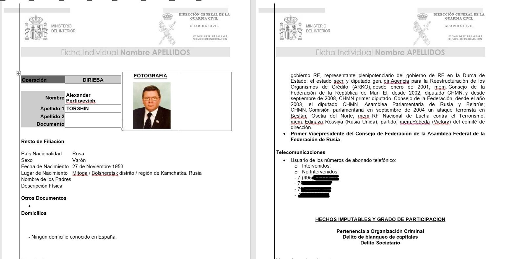 Romanov met Torshin back in 1995, while working for the Bank of Russia; Deputy Chairman Torshin was his superior. However, Torshin asserts that Romanov is a personal friend of his, not a business associate. The Spanish investigators believe otherwise. «It appears that Romanov acts as an intermediary between Torshin and the leader of the Taganskaya criminal organization, Igor Zhirnokleyev,» reads the Spanish case file studied by The Insider. Torshin is mentioned in about a dozen investigation papers. One of them is Torshin's personal profile filled out by the Spanish Civil Guard (photo, phone number, ties to organized crime and other connections). Twelve pages of detailed personal charges against Torshin, a digital file with transcripts of wiretapped phone conversations between Torshin and Romanov or between Romanov and other defendants, where they discuss orders given by «Porfiryevich» (Torshin's patronymic), and documents pertaining to the Taganskaya gang and Alexander Romanov criminal case.