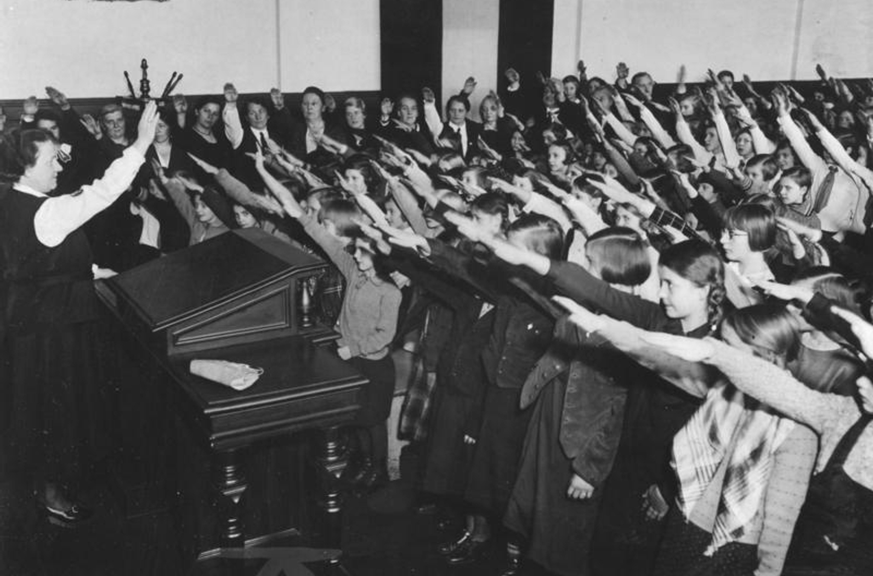 Religious instruction was gradually phased out. Formally, the subject of “Religion” remained on school schedules, especially in Catholic and Protestant regions, but the number of hours was reduced and the content became increasingly subordinate to state ideology. As Sal Perel, a Jewish boy who attended school under a false name, recalled: “Hitler was God. I would say that if Christians have the Father, Son, and Holy Ghost, then Germany’s Holy Trinity was Führer, Volk, und Vaterland — and the greatest of these, of course, was the Führer.” Confessional schools were merged into “state community schools” (Gemeinschaftsschulen), where religious elements were reduced to a minimum.