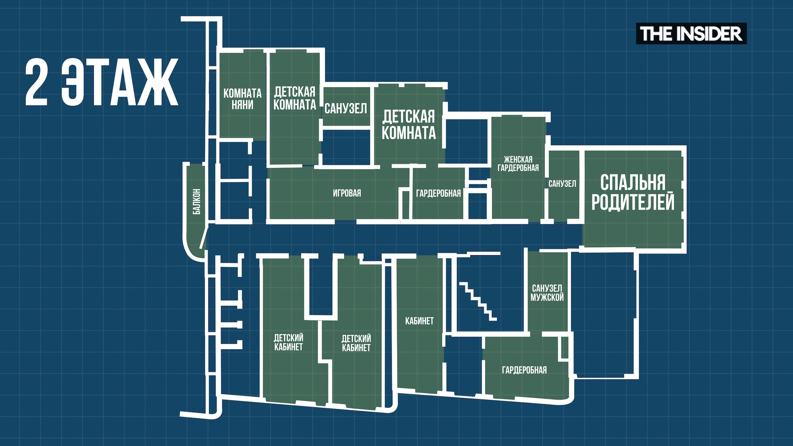 The 75-square-meter master bedroom is on the second floor, accessible via an ornate spiral staircase. Adjacent to the bedroom are two walk-in closets for Kostin and Asker-Zade and two separate master bathrooms. There is also a two-square-meter “jewelry storage” room and the master's study. The second floor holds two children's bedrooms, two children's studies, and a separate playroom. Above the pool is a gym with an area of almost 170 square meters.