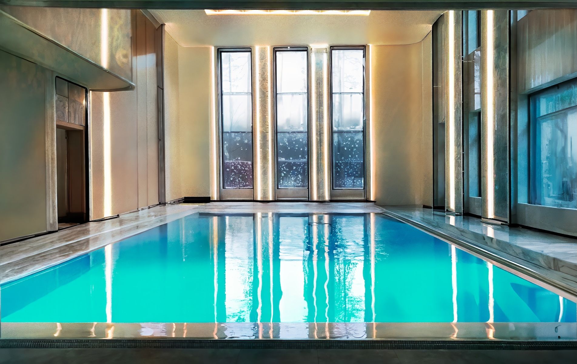 The estate also boasts a huge spa center equipped with a 20-meter swimming pool, jet tub, sauna, hammam steam room, and plunge pool. Adjacent to the spa are a billiard room and an “alpine room.” The house has a separate entrance for personnel and deliveries.