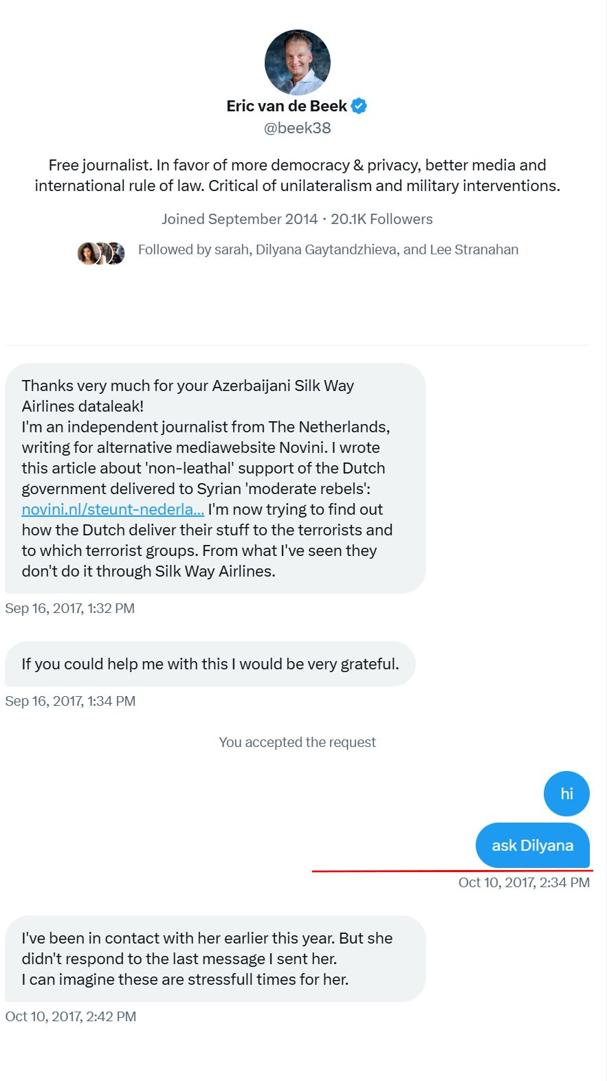 As with other GRU hacking teams, Stigal’s sought out and relied upon external actors to disseminate information illegally obtained. One of Unit 29155’s helpmeets is Dilyana Gaytandzhieva, a Bulgarian journalist once celebrated for her fearless door-stepping reportage. Chats examined by The Insider show Stigal ostensibly first contacted Gaytandzhieva via Twitter, leaking to her and encouraging her to publish a data set of cargo airline traffic and inventories allegedly found in the Azerbaijani Embassy in Sofia. The hacked dataset allegedly showed that Silk Way Airlines, an Azerbaijani private cargo company, was transporting U.S.-commissioned weapons shipments using diplomatic flights.