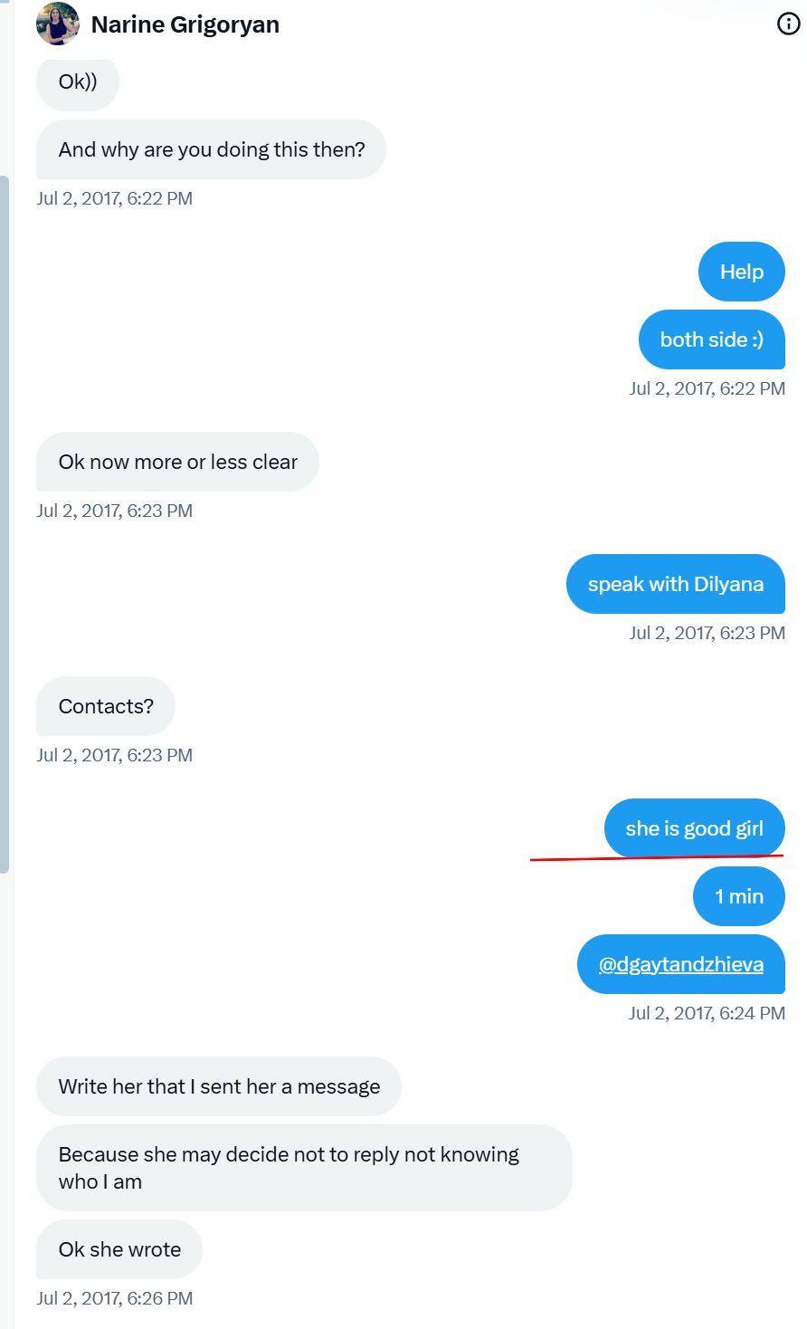 In a reply to Grigoryan’s question, “How can I help?” Stigal wrote, “Ask Dilyana, she’s a good girl,” and encouraged Grigoryan to try to contact Gaytandzhieva via Telegram.