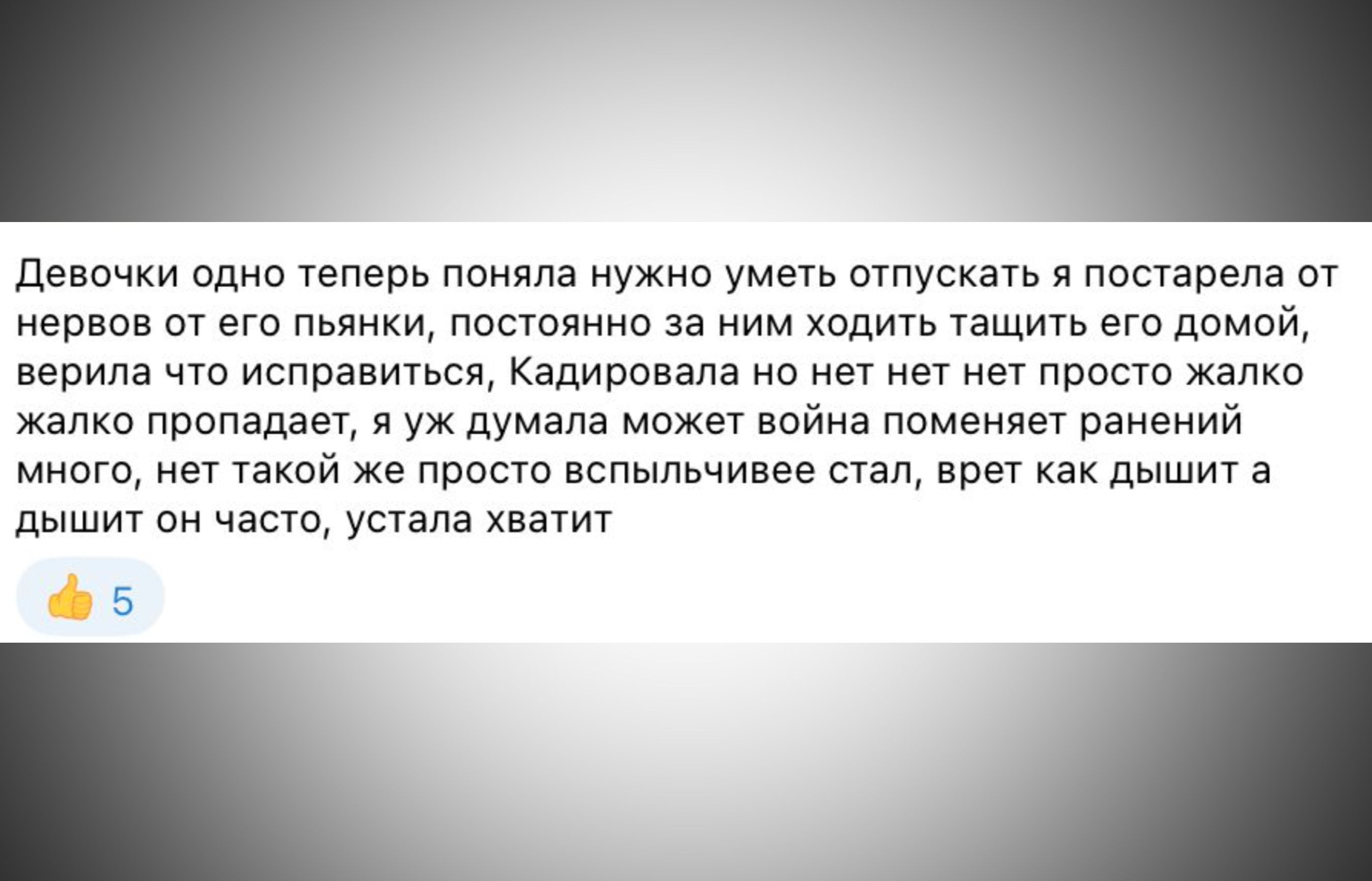 The chats discussing the mercenaries’ return – or failure to return – from the front line are also. Grieving women rejoice if their husbands remain alive, and omit details of their biographies. The women try not to talk about the fact that their partners killed people in Ukraine. Many write about “defense of the Fatherland.” Those who bring up the ex-convicts' pasts are quickly silenced by other women. One of the dialogues read: