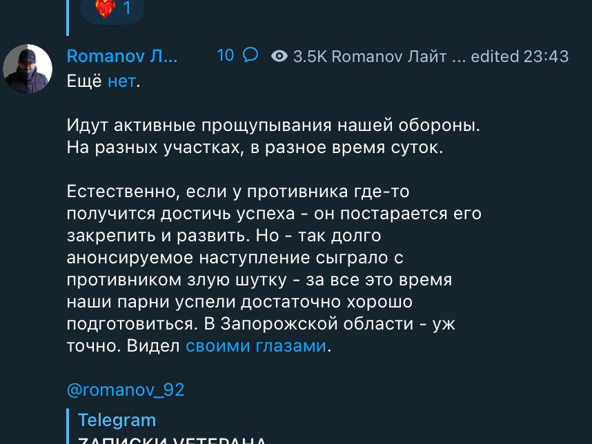 “At night there was the strongest pressure on our positions from the enemy in the Orikhiv direction. The enemy was coming in waves. At least two attacks were repelled by our military. Unseen before. [...] The enemy managed to occupy some heights, but as a whole no deep breakthrough was achieved during this night. Eyewitnesses wrote that the enemy is throwing unit after unit into battle. A lot of equipment. Our aviation [groups] are rotating over and over. A lot has been destroyed. It's a real harvest,” a pro-war Telegram channel Zapiski Veterana (“Notes of a Veteran”) reported .