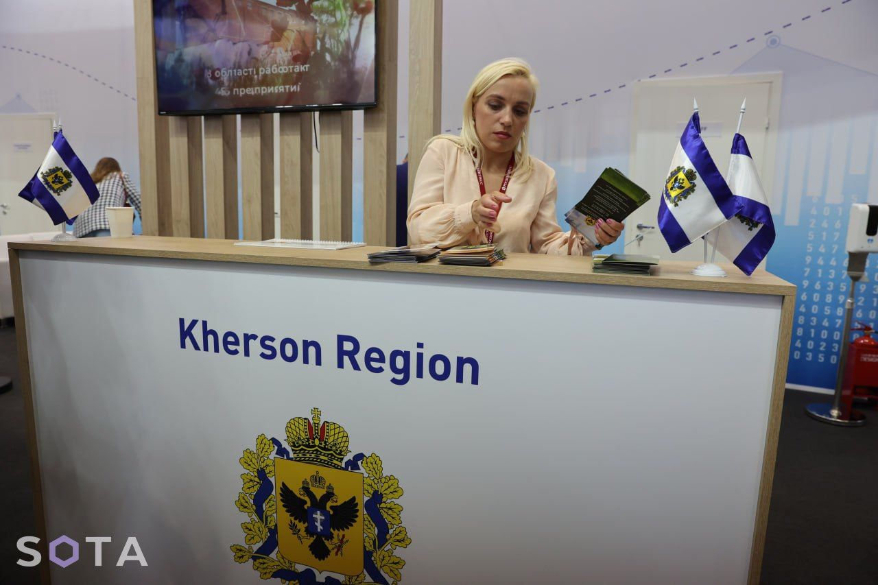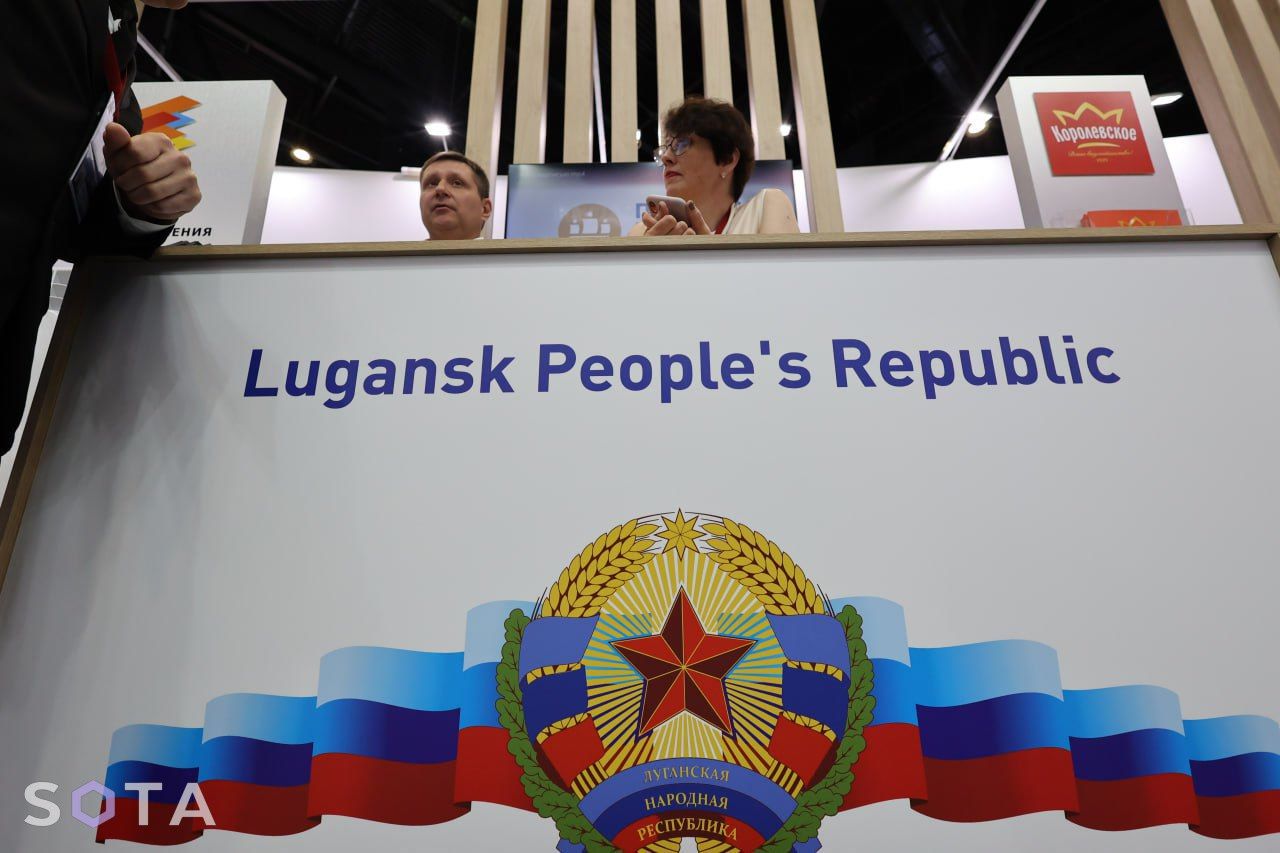 Ukrainian regions annexed by Russia also had stalls at the forum. The Minister of Culture, Sports and Tourism of the annexed Zaporizhzhia region Radik Isyakaev was seen personally handing out boxes with “Melitopol cherries” which were “grown in Russia.” Tables of delegations from the occupied Kherson region, as well as the so-called “DPR” and “LPR” were adorned with information booklets.