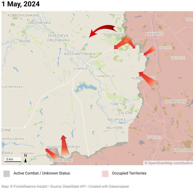 - North of Avdiivka, the advance of the Russian Armed Forces threatens the important Pokrovsk-Kostiantynivka highway.