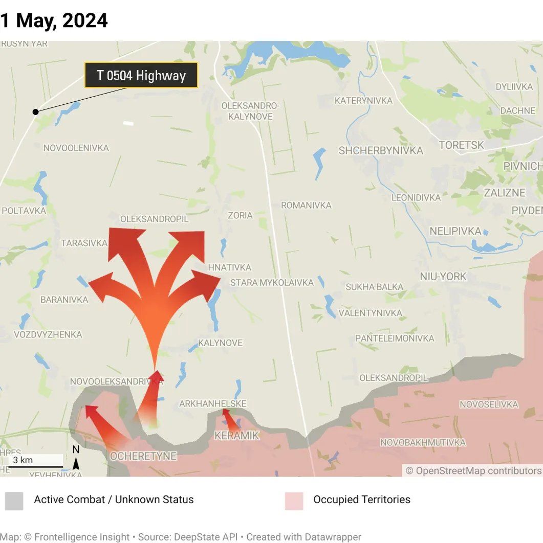 Over the past week, Russian forces have sought to build on territorial gains recently made around Ocheretyne, north of the Avdiivka operational area. They have managed to take control of Keramyk and Novokalynove, enterArkhangelske, and advance to within 10 kilometers of the Pokrovsk-Kostiantynivkahighway, an important logistics artery for the Armed Forces of Ukraine (AFU) in Donbas.