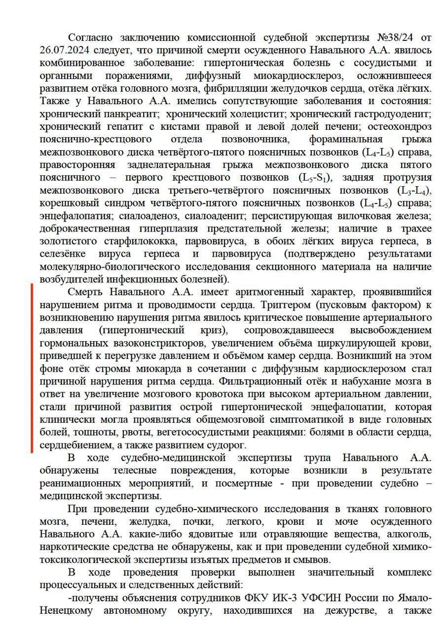 The first sentence regarding the medical reasons for Navalny's death (highlighted above in red) reads: