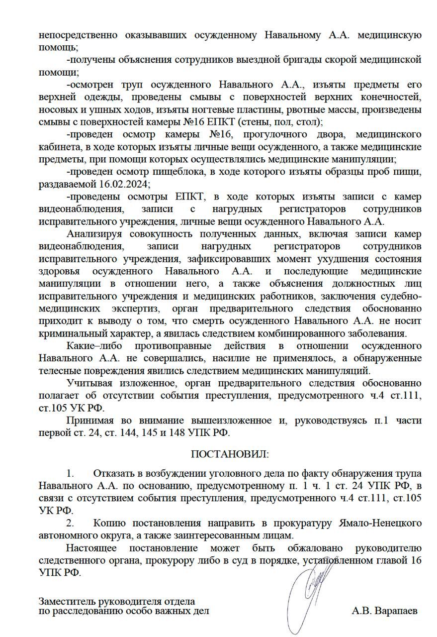 “This is a resolution of the Investigative Committee for the Yamalo-Nenets Autonomous District. It is signed by the same Major Varapayev, who refused to give Alexei's body [back] to his family and attempted to blackmail his mother into agreeing to a secret funeral. [...]I know that's not true. I know that Varapaev's ruling is a lie and they are covering up what really happened on that day. We know very well that when Alexei became ill, he was taken not to the medical center, but back to his punishment isolation [SHIZO] cell. That he died there, alone. That he was taken to the infirmary unconscious. That in the last minutes before his death he complained of a sharp pain in his stomach. Why isn't all this in the Investigative Committee’s ruling? Where is the footage from the cameras, which are everywhere in the [penal] colony, including the toilets? Where is the footage from the body cams of the prison staff who locked the dying man in the concrete box of the punishment cell?”The contents of the Investigative Committee's letter (in Russian) can be found below: