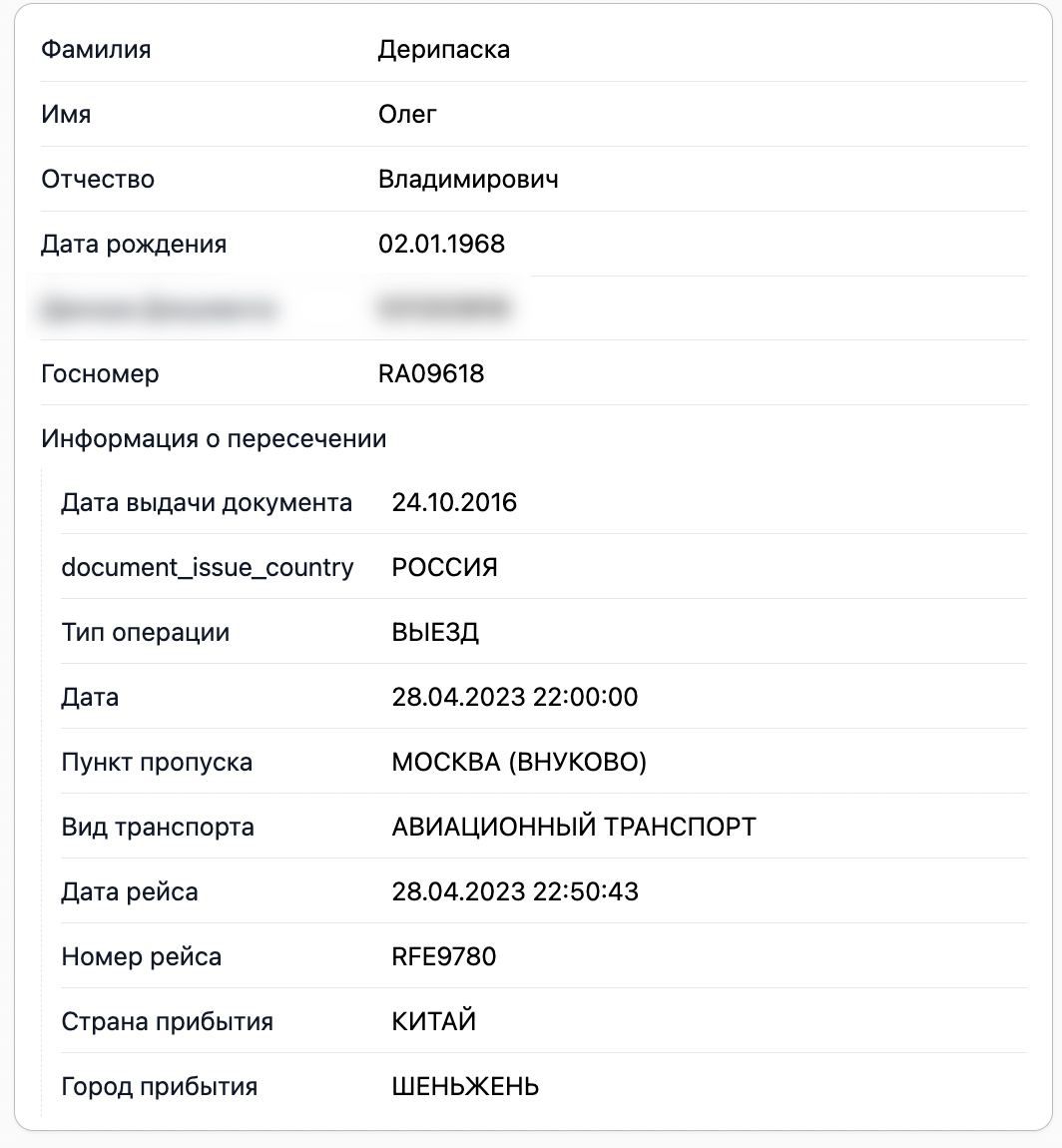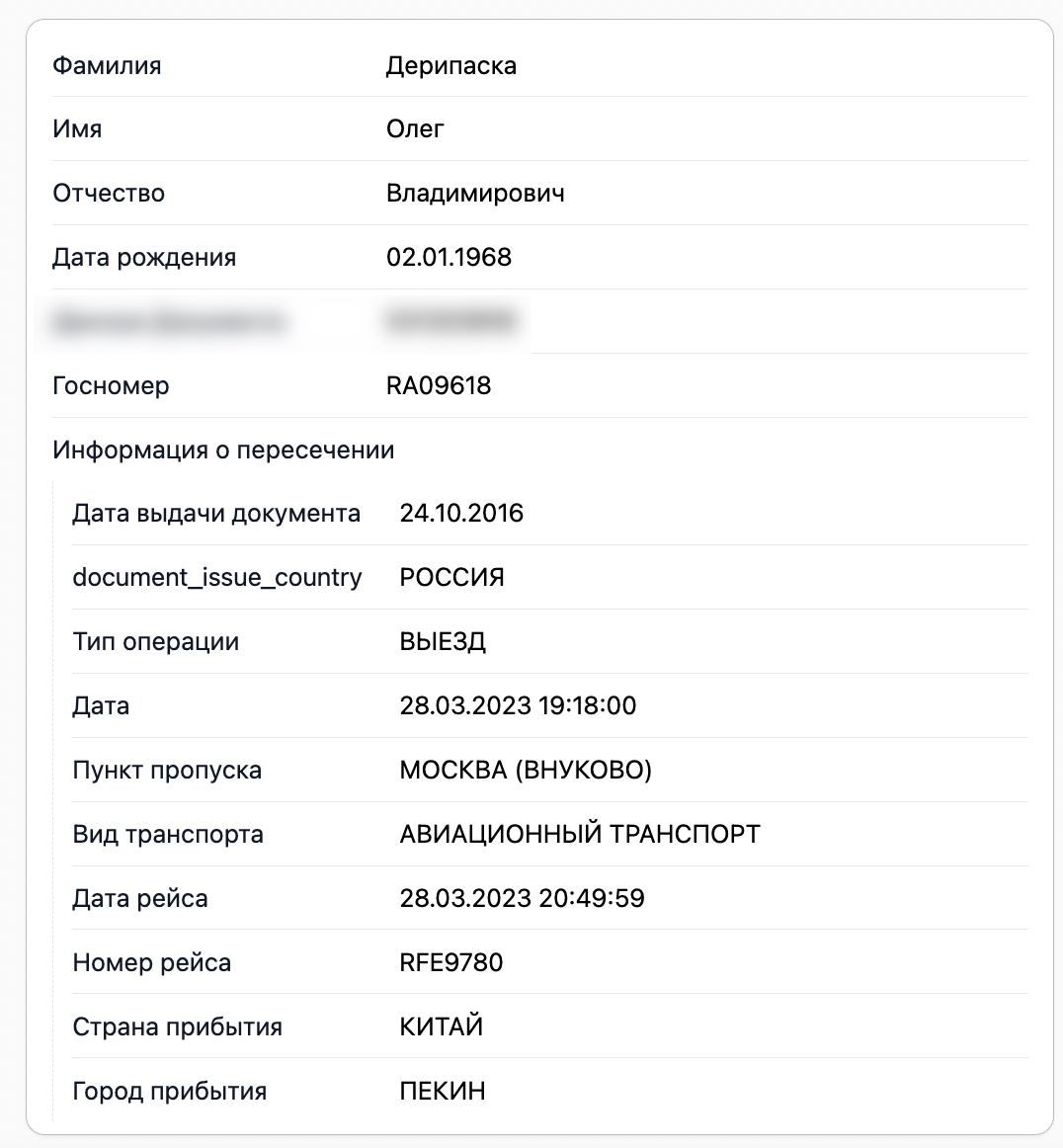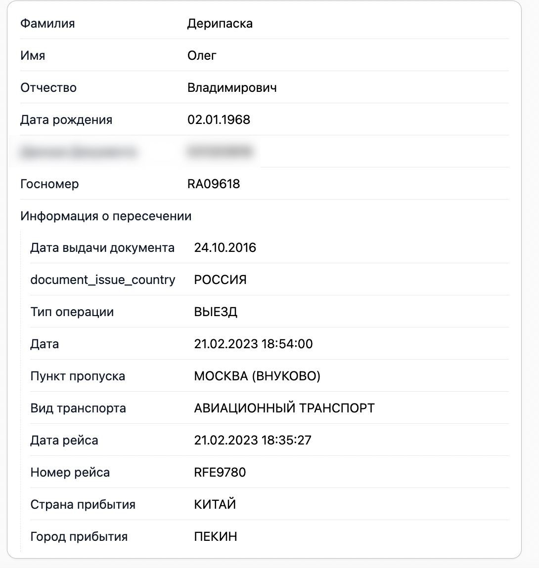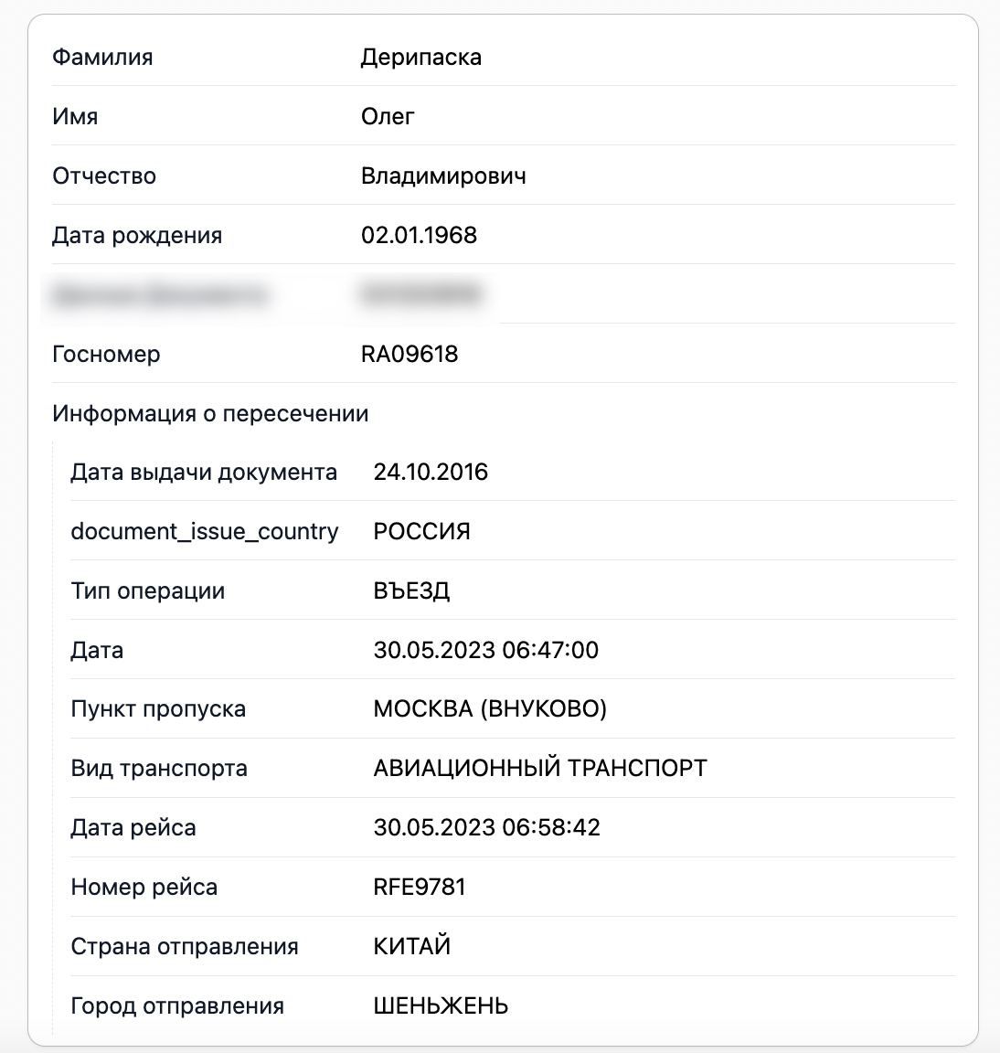 Border control data from the FSB, obtained by The Insider, confirms Deripaska’s presence on board the jet during these flights.