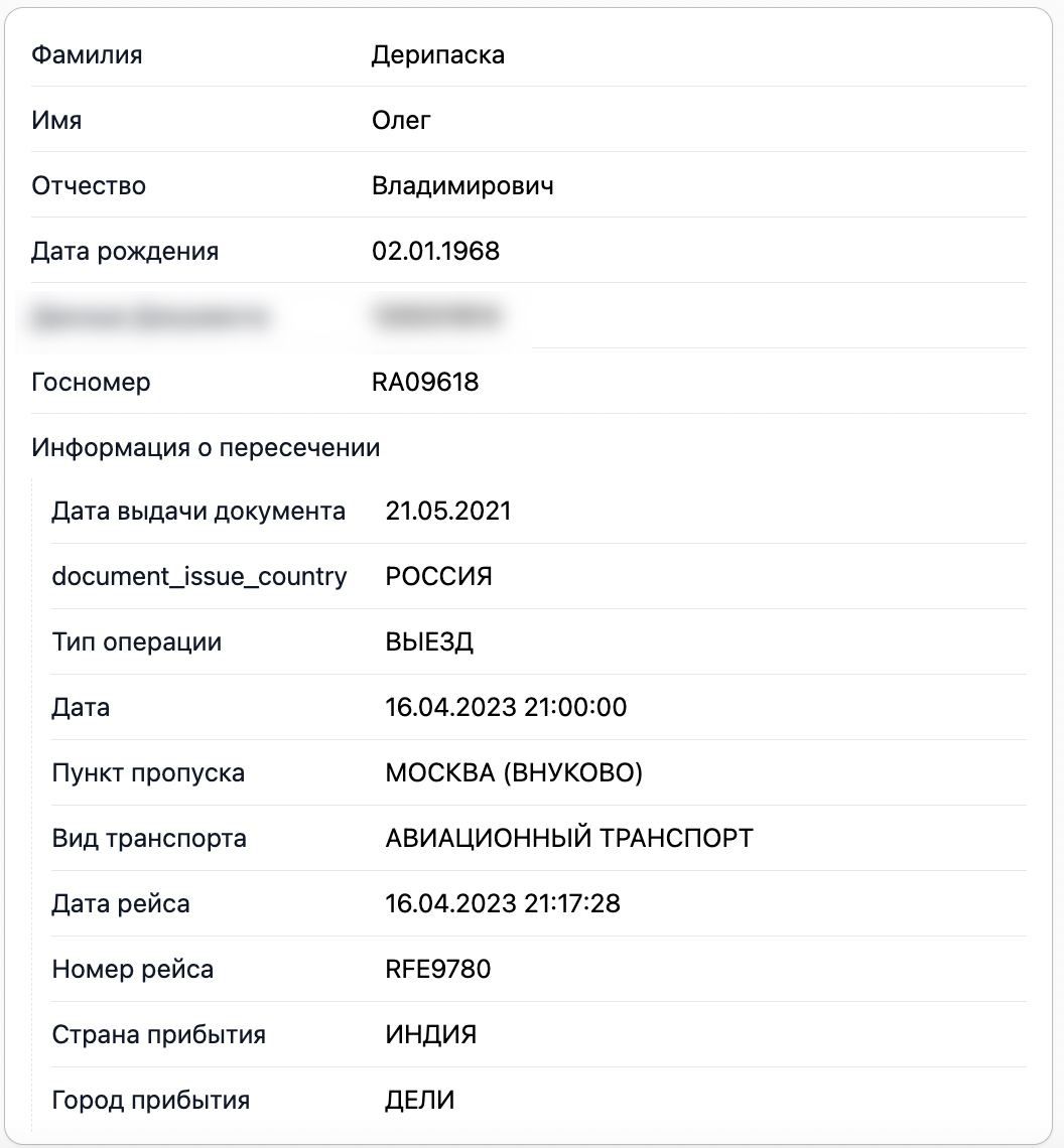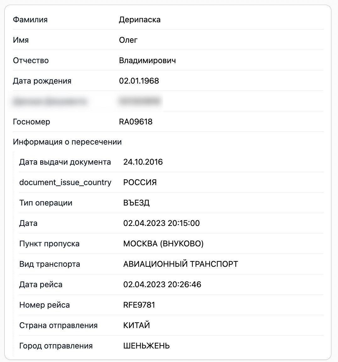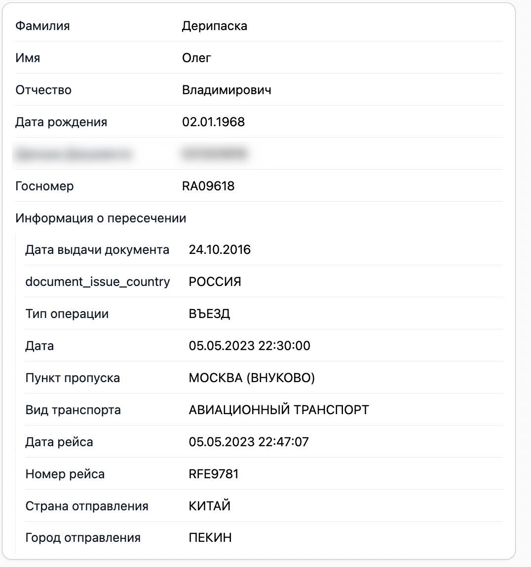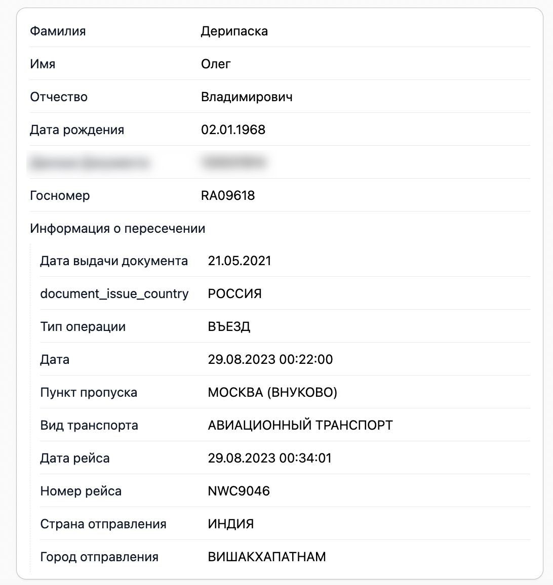 Border control data from the FSB, obtained by The Insider, confirms Deripaska’s presence on board the jet during these flights.