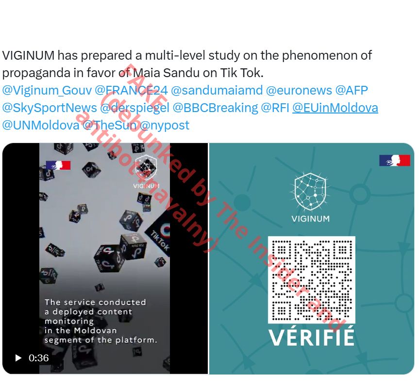 One video, which purports to have been produced by the French government’s anti-disinformation agency VIGINUM, is being shared on Twitter with the caption: “VIGINUM has prepared a multi-level study of the pro-Sandu propaganda phenomenon on TikTok.” The clip claims that $1 million per day was spent on producing and promoting pro-Sandu disinformation videos.