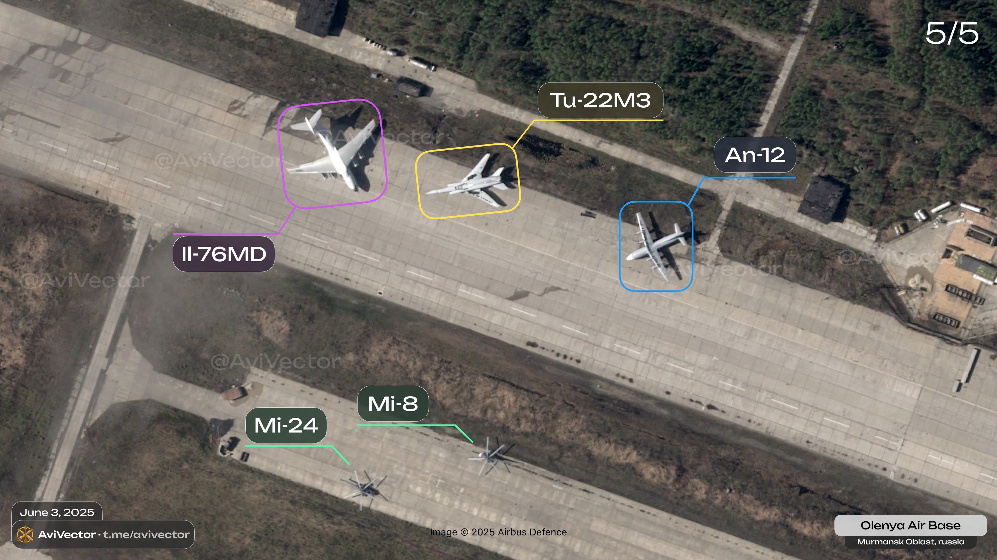 A synthetic aperture radar (SAR) satellite image dated June 2 and shared by Ukrainian military-linked social media accounts shows the same overall picture: namely, the destruction of four Tu-95 bombers and one An-12 at Olenya air base in Russia’s Murmansk Region.