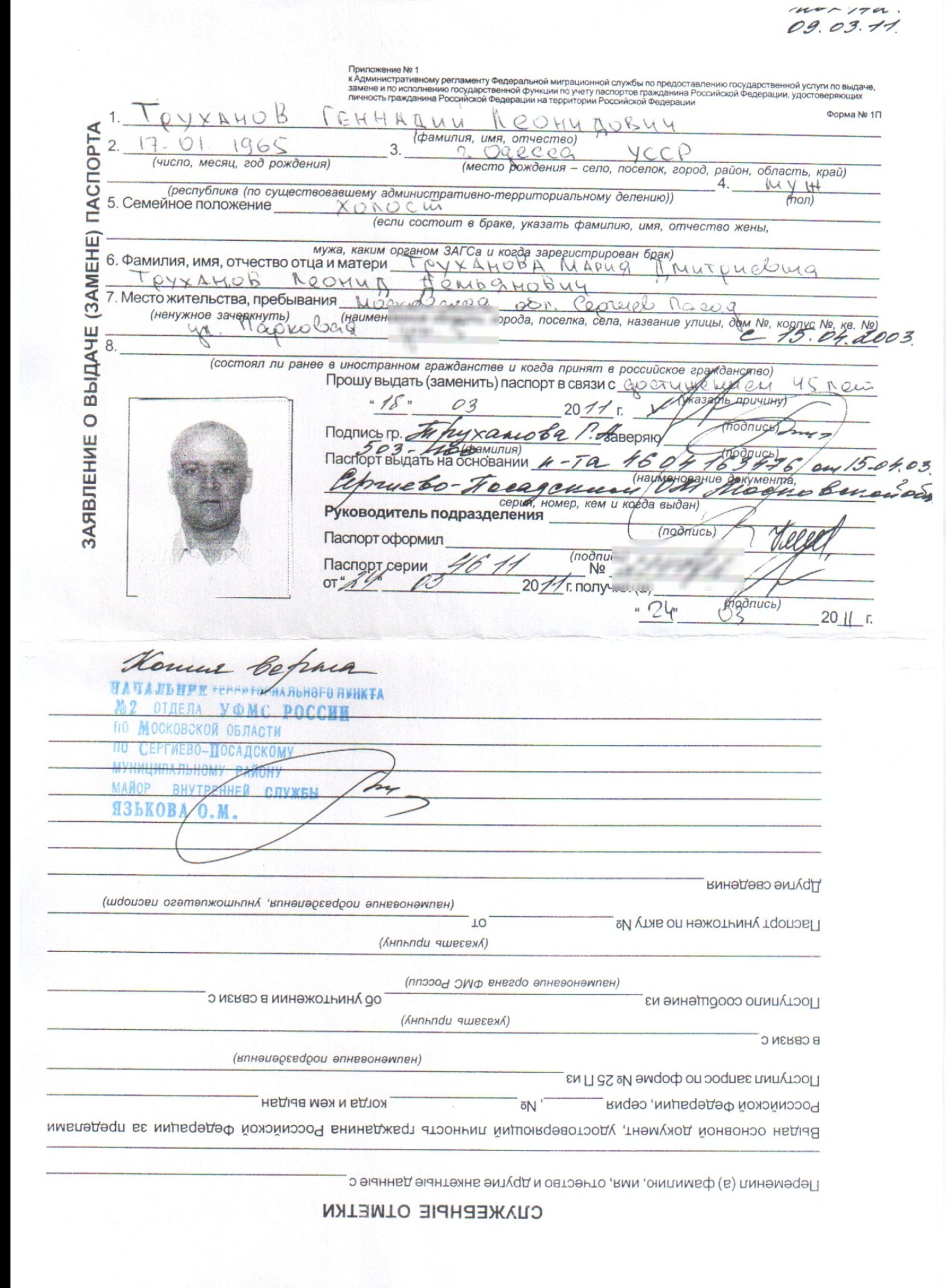 According to The Insider’s findings, Russian databases indeed show that Trukhanov once held Russian citizenship — in fact, he has held two Russian passports. The first, with a number beginning 4604, was issued on April 15, 2003, and was later reported as lost. The second, beginning with 4611, was issued on March 24, 2011, by the Main Directorate of the Interior Ministry for the Moscow Region “as a replacement for the lost one.” The application for that passport, also obtained by The Insider, cited “reaching the age of 45” as the reason for the request.