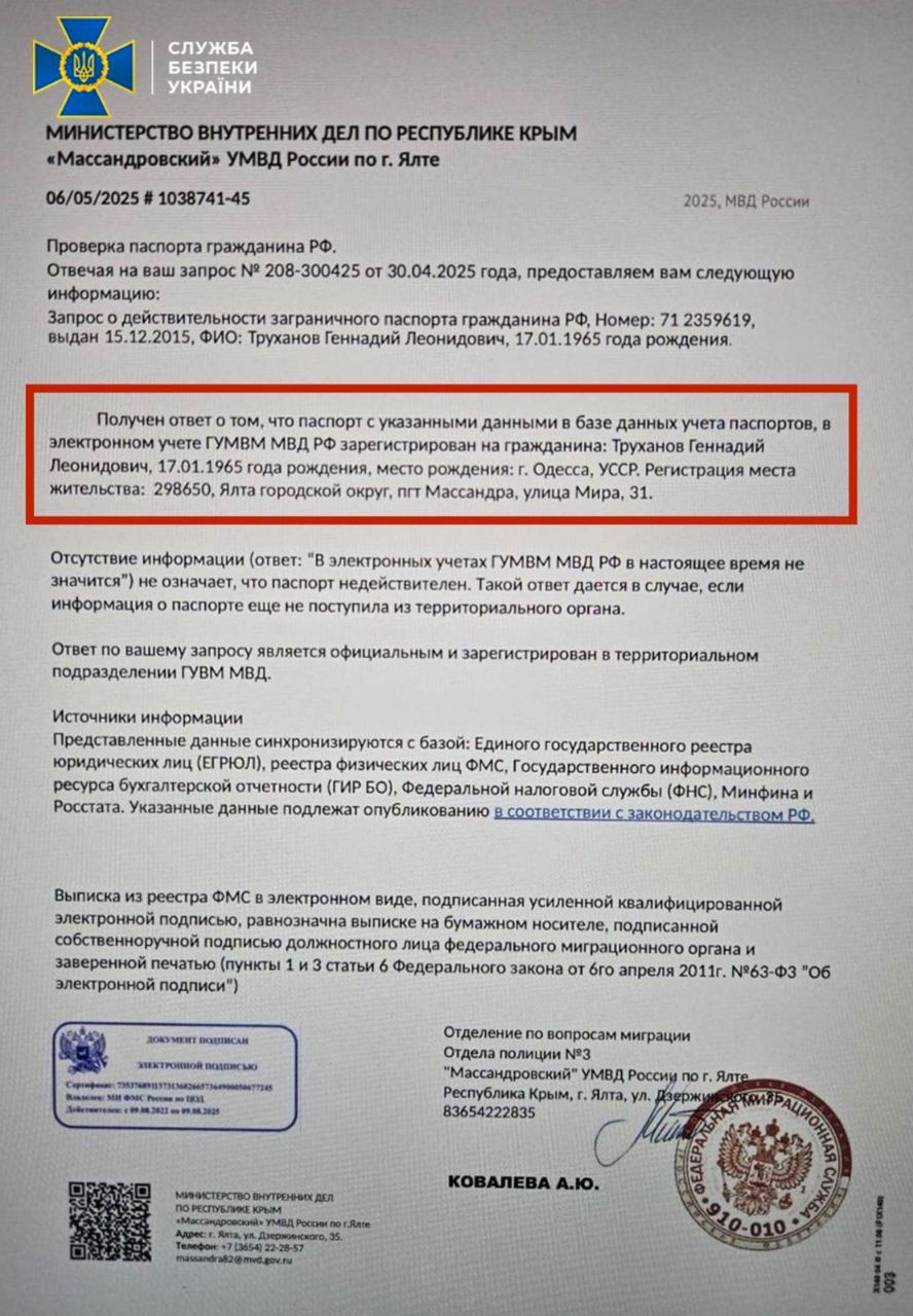 On Tuesday, October 14, the Security Service of Ukraine (SBU) released copies of documents that served as the basis for revoking the Ukrainian citizenship of Odesa Mayor Hennadiy Trukhanov. Among them were a copy of a document from the Russian migration service confirming that Trukhanov held Russian citizenship, as well as two other documents: a copy of his international passport and an extract from the electronic registry of the Crimean migration service stating that the passport belonged to him. (In Russia, citizens are issued two separate “passports”: one for domestic use, and one for travel abroad.)