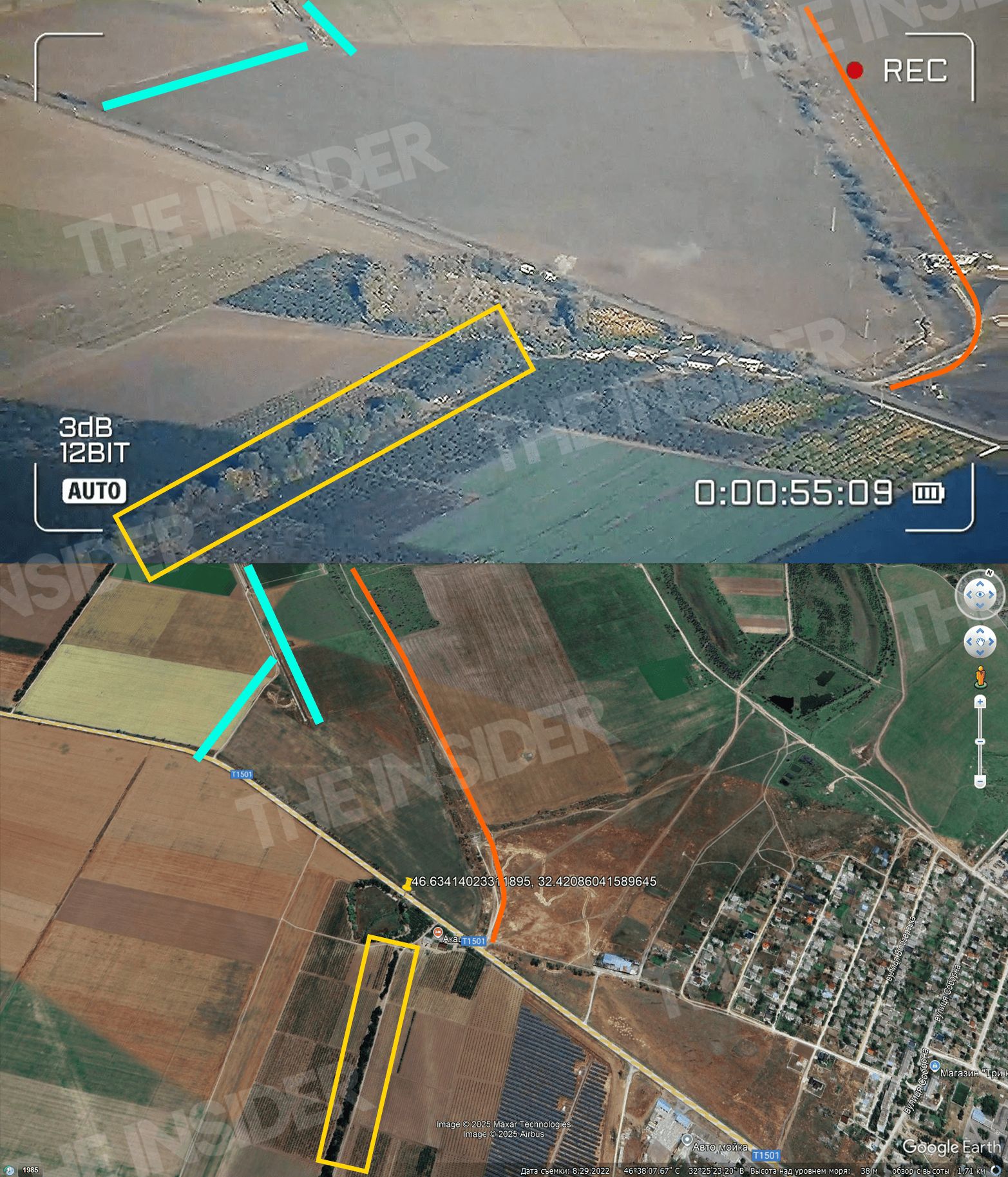 The channel adds that the strike on the column took place near the village of Bilozerka — a location that matches the Ukrainian reports. The Insider geolocated the exact site of the attack to a site on the nearby highway, about one kilometer from the village and roughly 10 km west of Kherson.