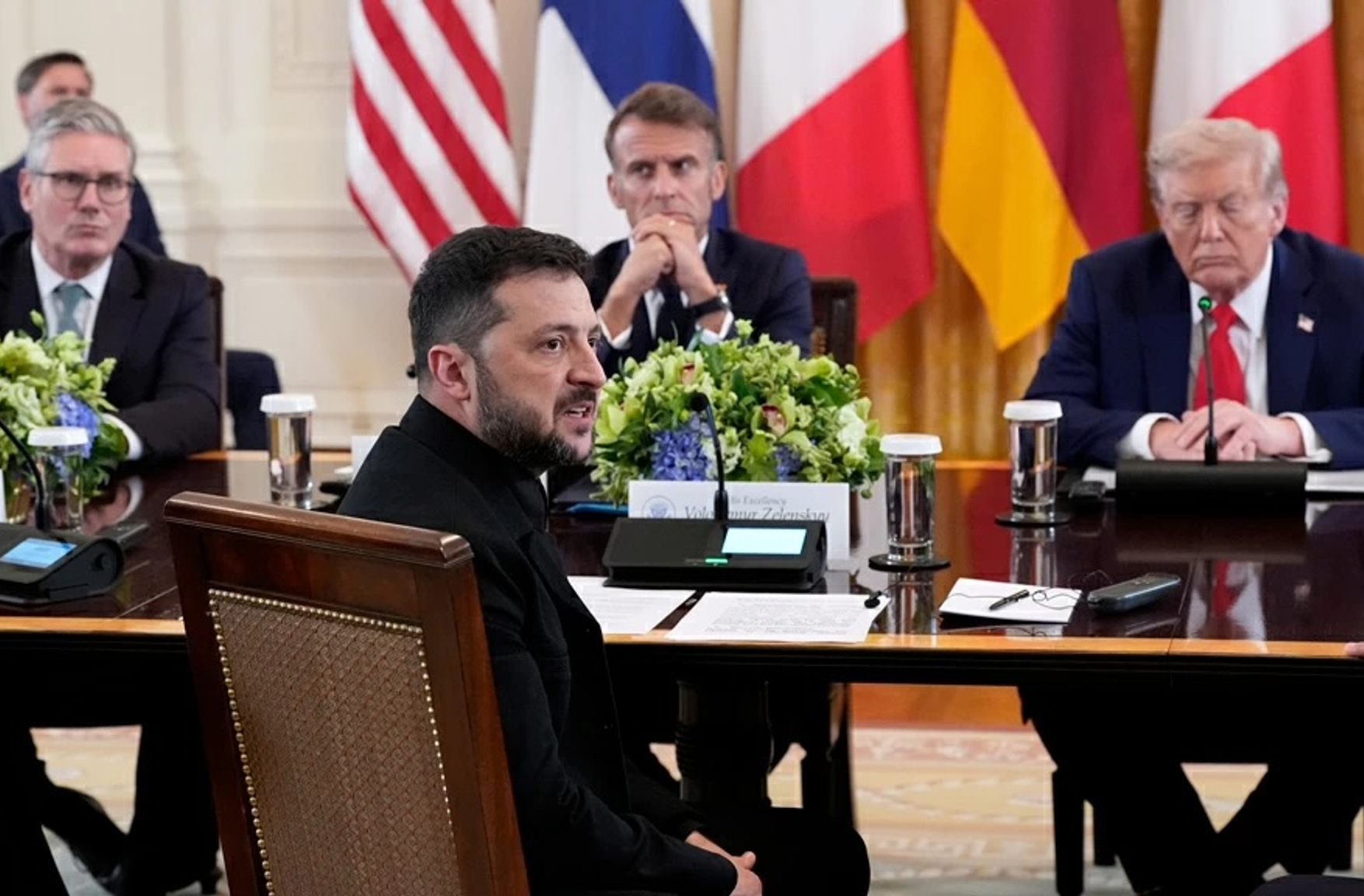 Ukraine’s President Volodymyr Zelensky speaks during a meeting in the East Room of the White House on Monday, Aug. 18, 2025, in Washington, as UK Prime Minister Keir Starmer, France’s President Emmanuel Macron and President Donald Trump listen in the background. Photo: Alex Brandon / AP Photo