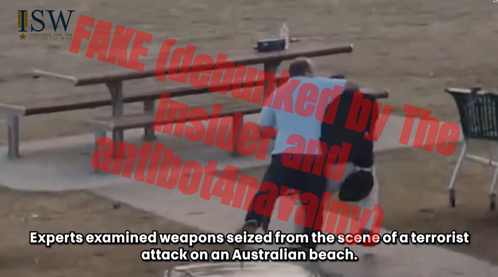 One video circulating on Twitter (X) and Bluesky is disguised as content produced by the Institute for the Study of War (ISW). It claims that experts found markings on the shotguns used by the attackers in Sydney that are supposedly applied to weapons delivered to Ukraine. The video falsely claims that Ukraine has become the “largest source of weapons for the black market.”