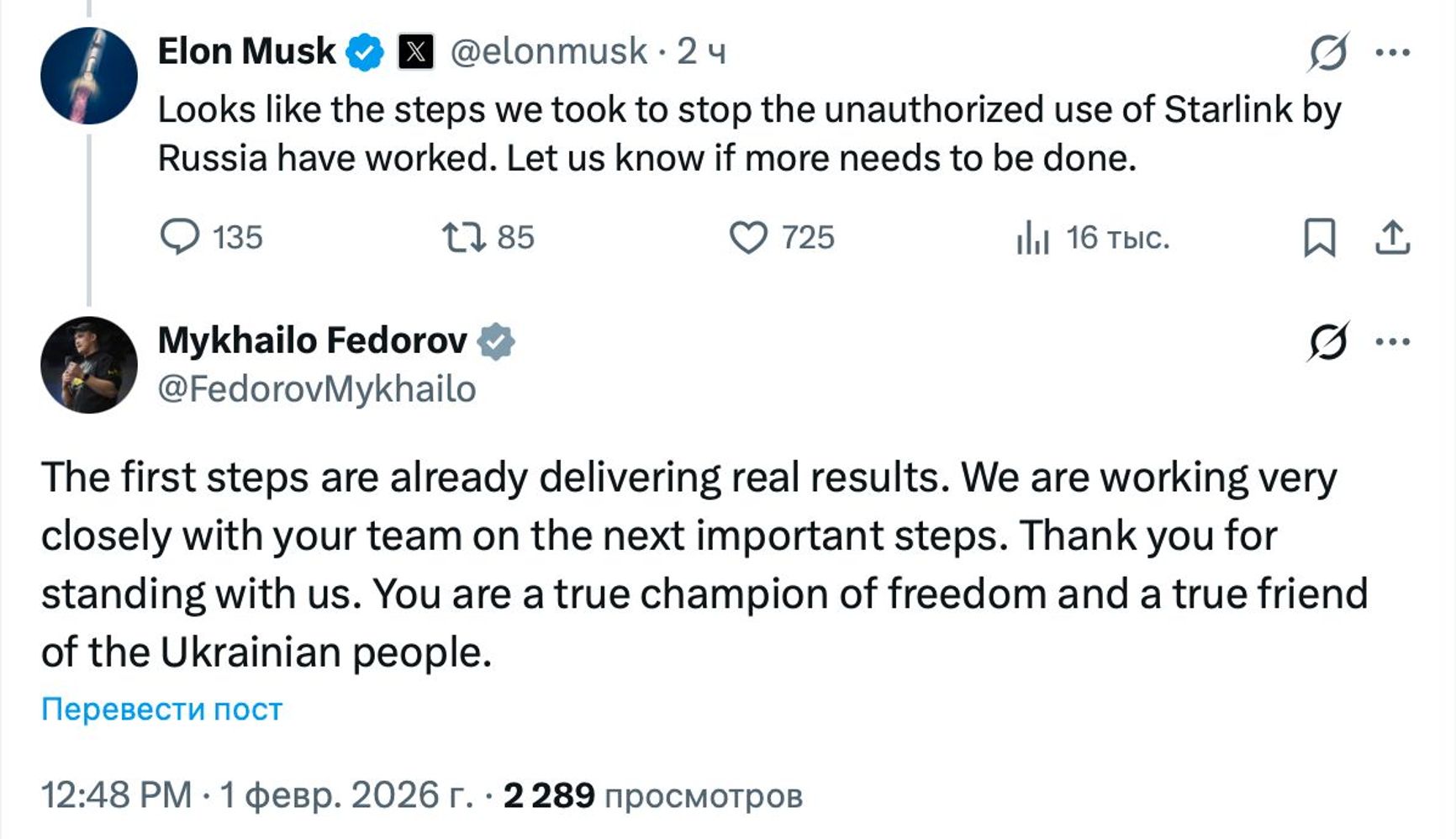 According to an exchange on X between Fedorov and Elon Musk, measures taken by SpaceX to prevent Russia from using Starlink to attack targets in Ukraine are yielding positive results.