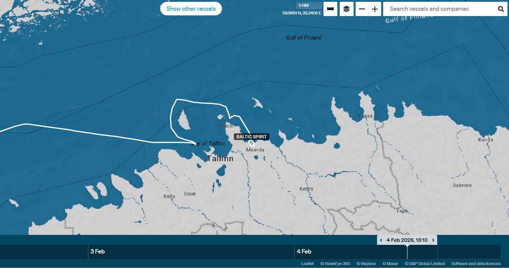 Data from Starboard Maritime Intelligence reviewed by The Insider showed the ship remained in the same location for about 15 hours before entering the port of Muuga around 1 p.m. on Feb. 4.