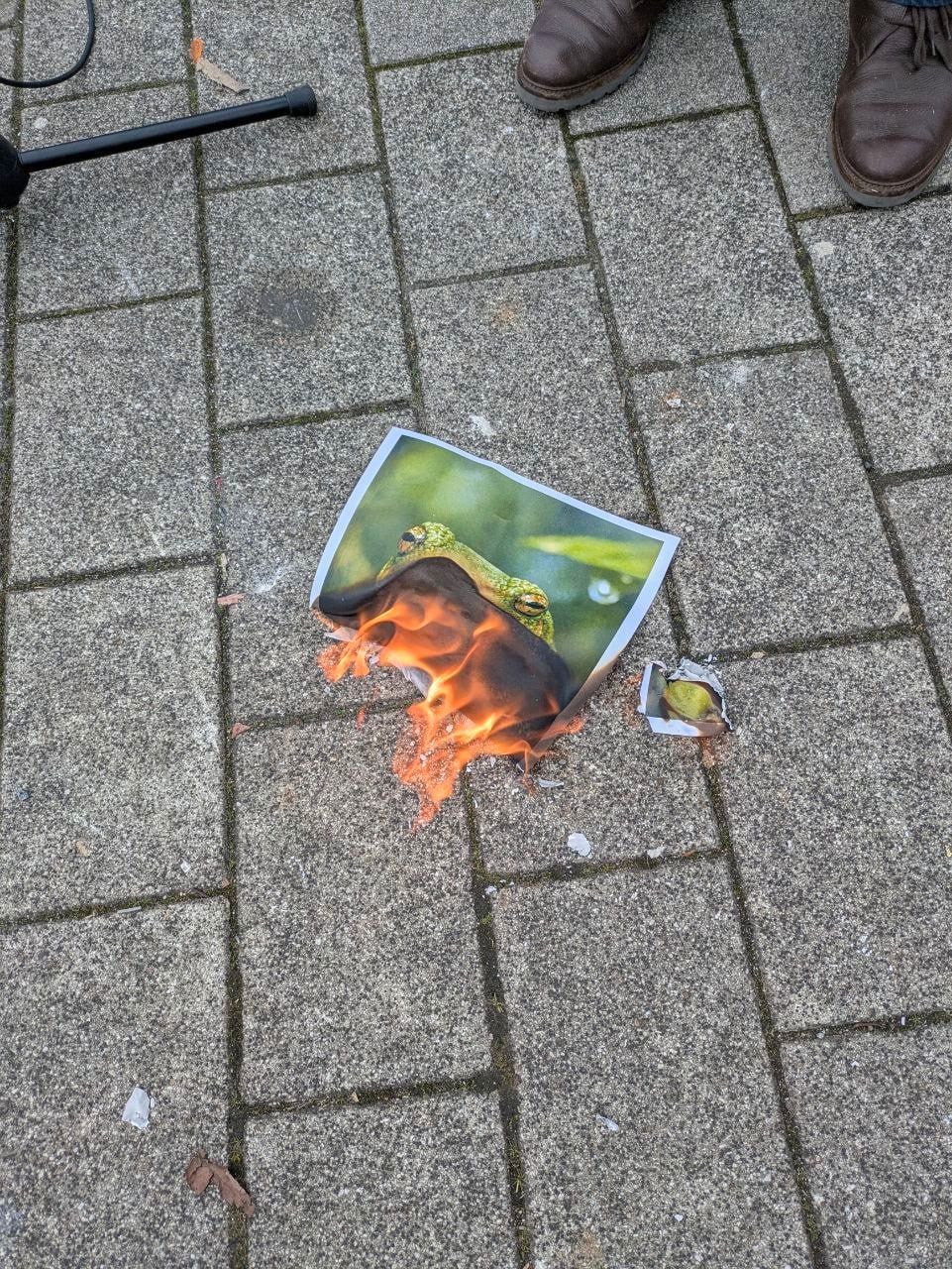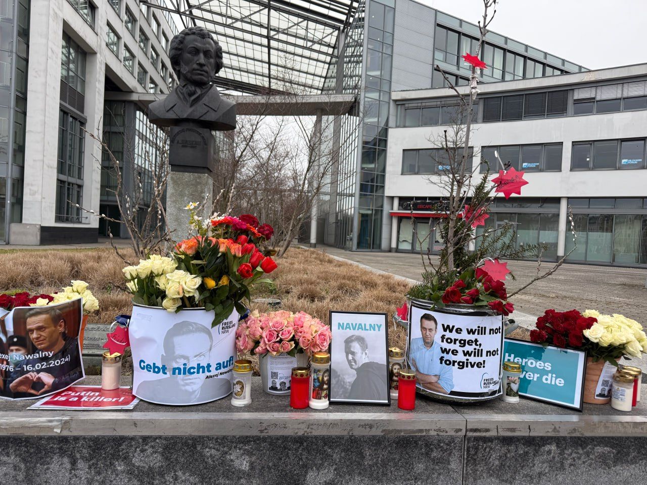 Memorial events are also being held abroad. In the morning, Russian-speaking residents of Dusseldorf burned a photo of an Ecuadorian frog, laid flowers and candles, and put up banners and posters reading “We will not forget, we will not forgive.”