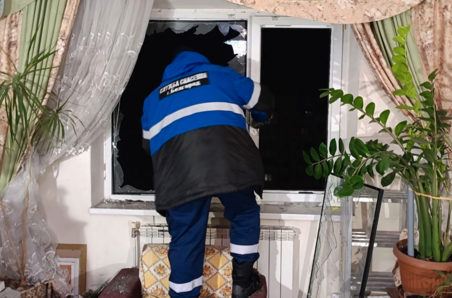 An emergency worker at an apartment in Belgorod damaged by Ukrainian shelling on February 13, 2026. Source: “Nastoyashchy Gladkov” (@vvgladkov) / Telegram