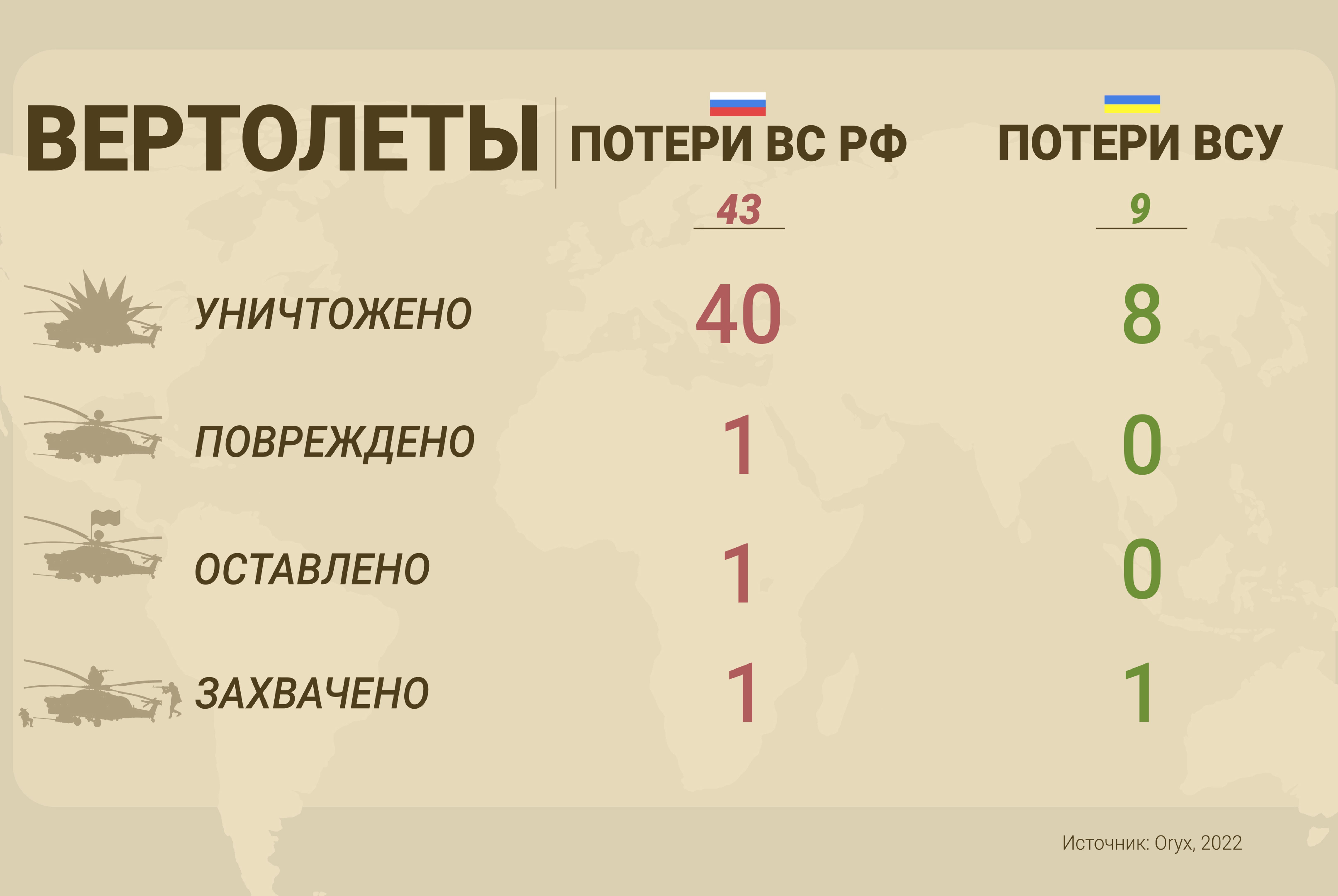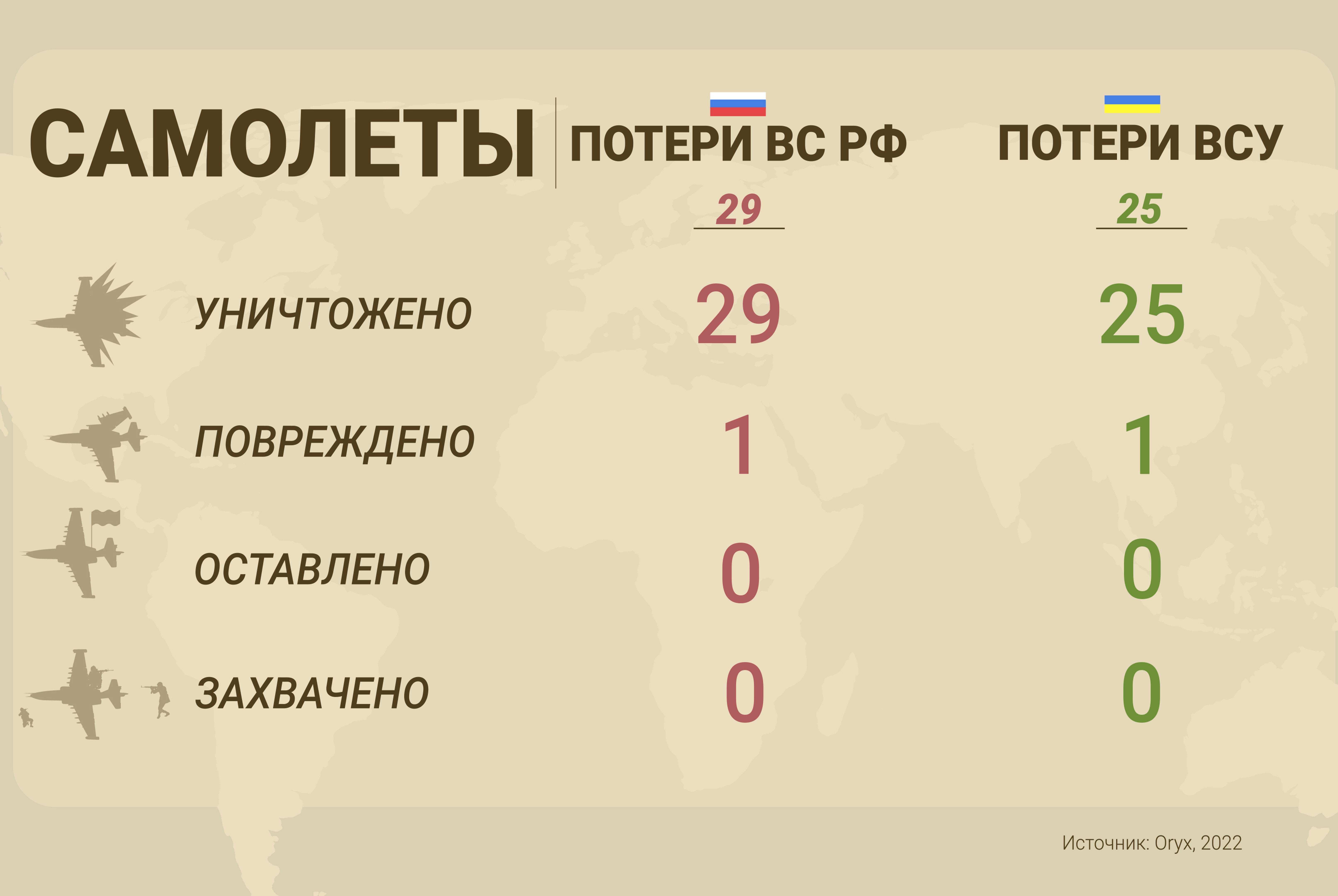 During the hostilities, Russia has lost at least 29 aircraft (including the most advanced Su-30SM multirole fighters and Su-34 frontline bombers), over 40 helicopters (including over a dozen Ka-52 Alligator strike and reconnaissance aircraft) and almost 80 UAVs. Given that the activity of Russian aviation has remained rather moderate during the entire period of the conflict, with only 100-150 sorties per day, and the intensity decreasing sharply after the cessation of fighting for Mariupol.