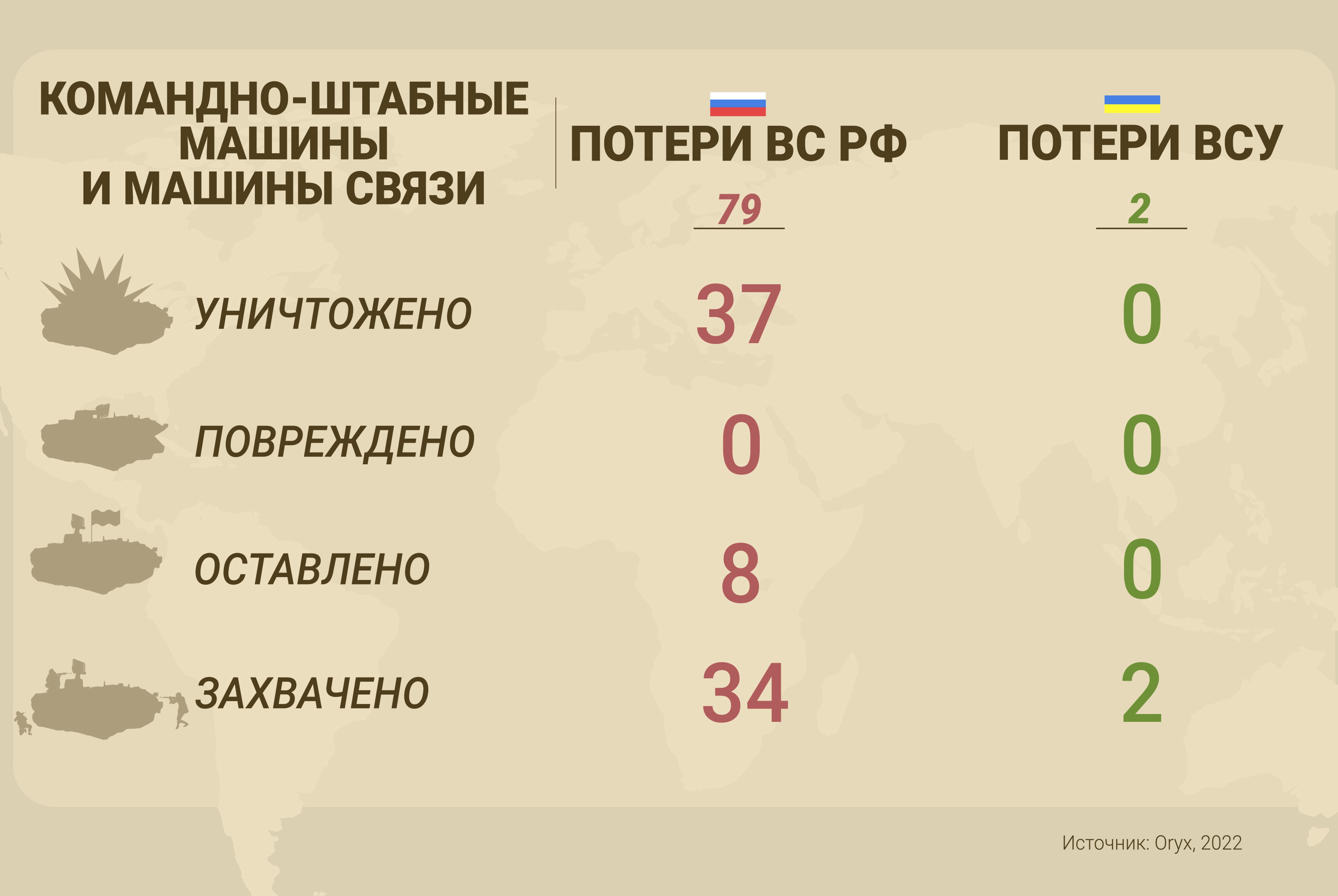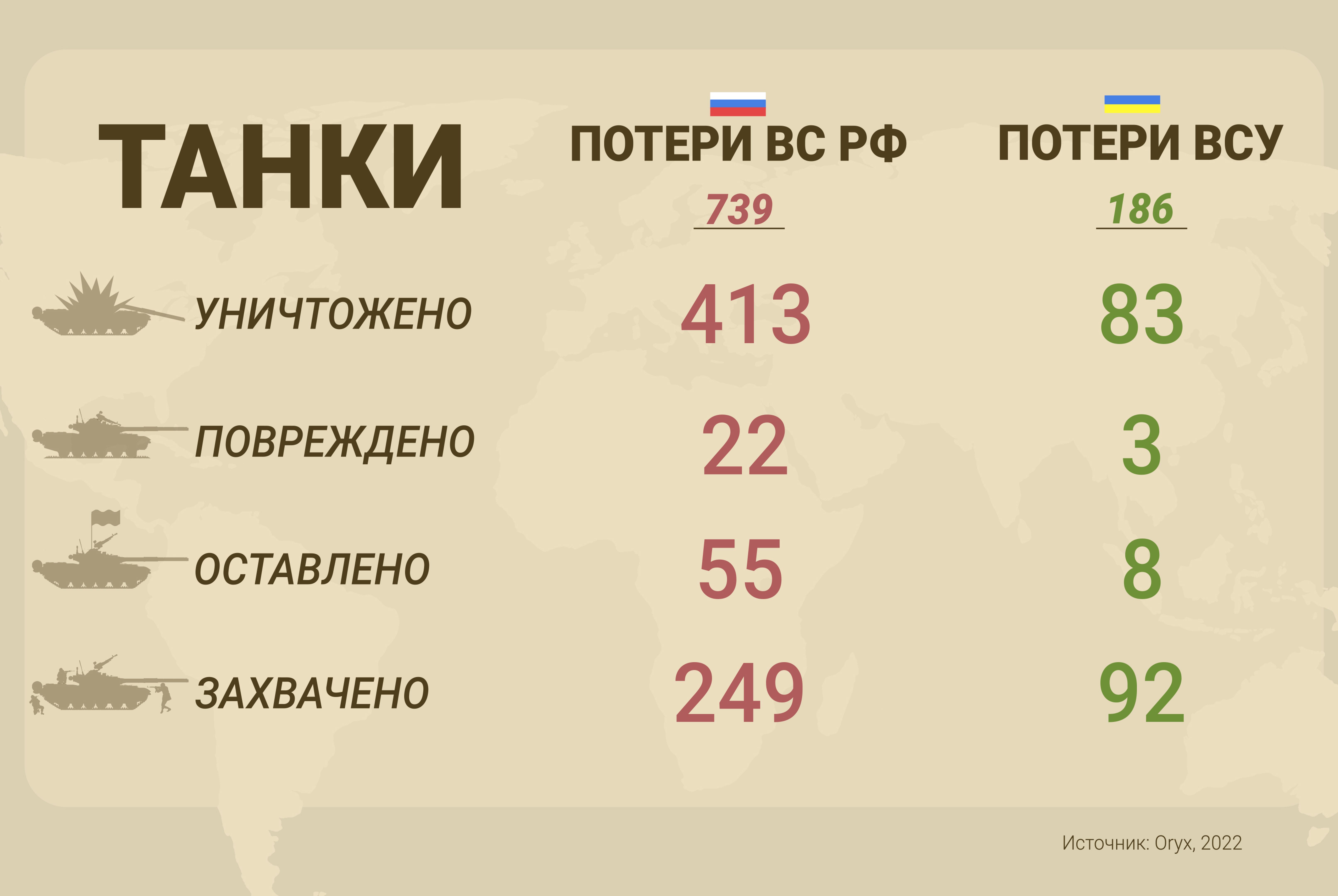 The Russian Armed Forces lost more than 700 tanks (including more than 200 of the most mass-produced T-72B3s), of which only 400 were destroyed or damaged in combat, while the rest joined the ranks of the Ukrainian army. Abandoned and captured vehicles account for up to half or more of the losses in other categories of armored vehicles. Known losses of the AFU are an order of magnitude lower.