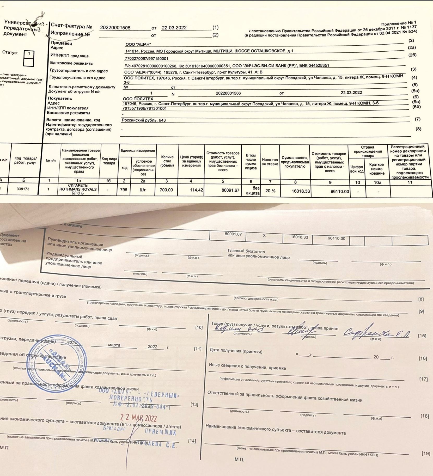 On the morning of March 22, 2022, a third-party carrier arrived at Auchan Severny to pick up the four pallets of “humanitarian aid,” including toothpaste. One person, “leading engineer Safronova E.A.,” signed for all 10 legal entities.