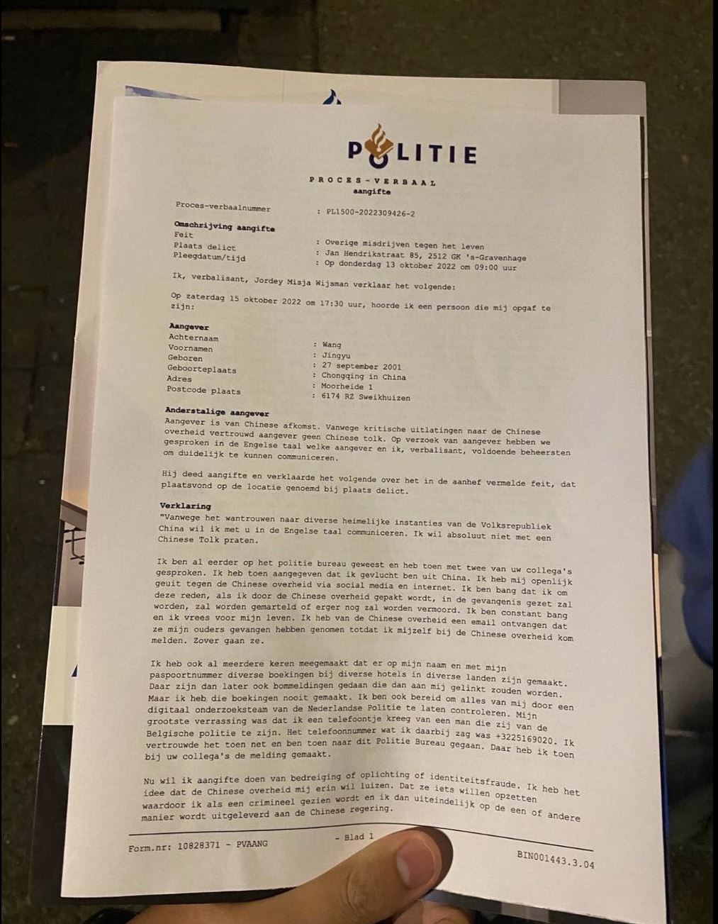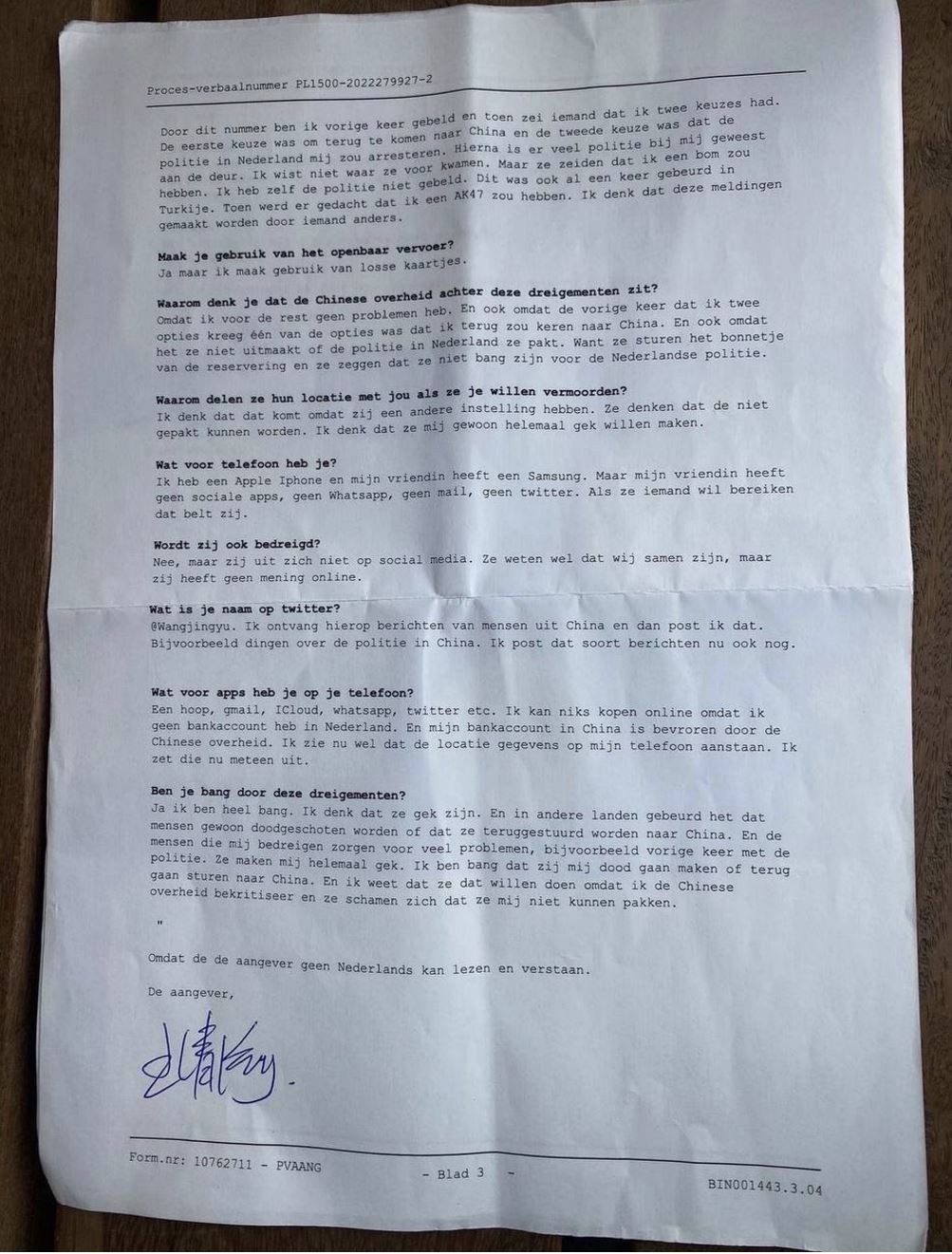 “On June 9, 2022, I received a message from an unknown number stating that a Chinese special agent, allegedly located in Germany, was supposed to come to the Netherlands to kill me. Of course, I didn't believe it, but just in case, I called the Dutch police and informed them that I was being threatened with murder.”
