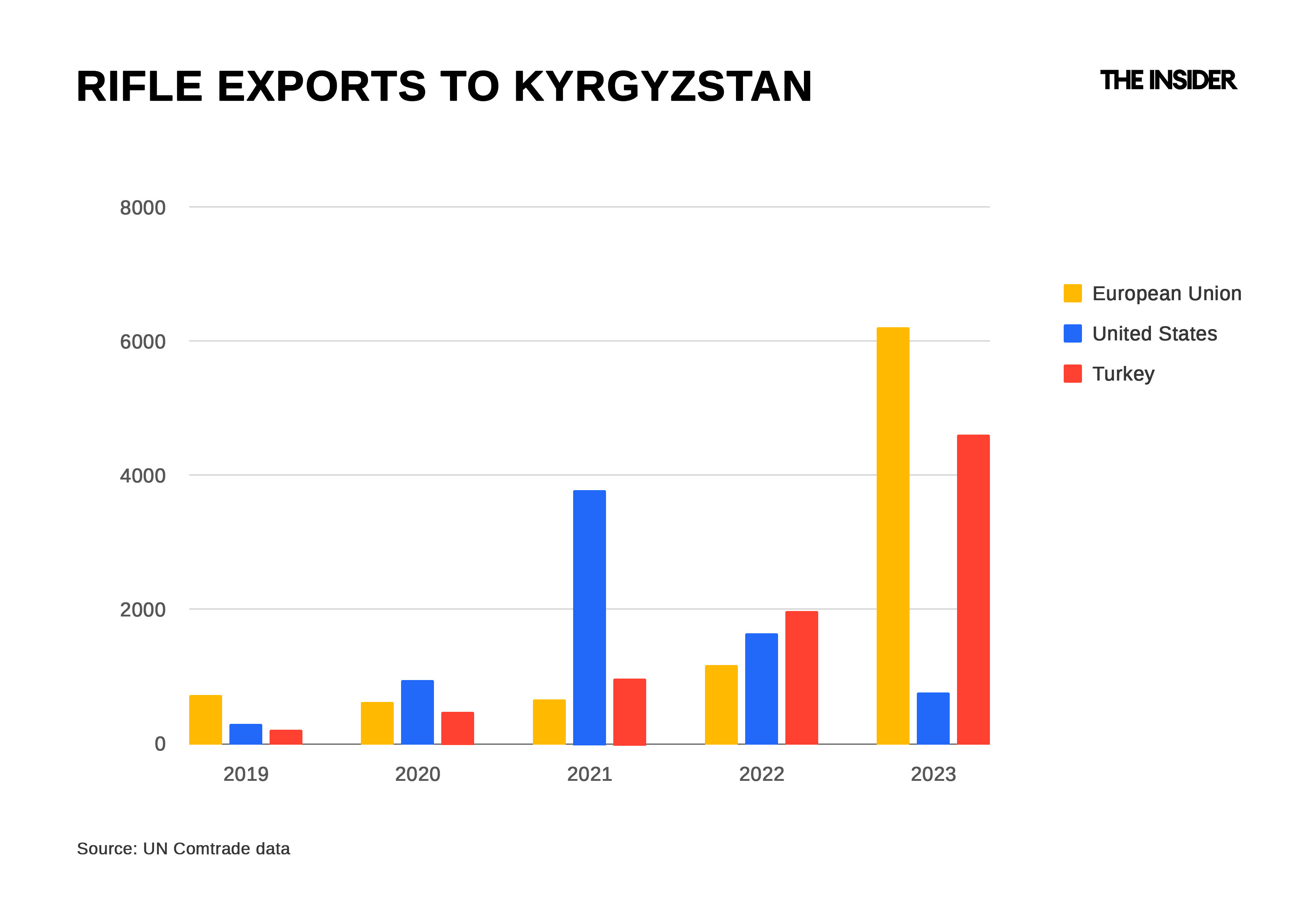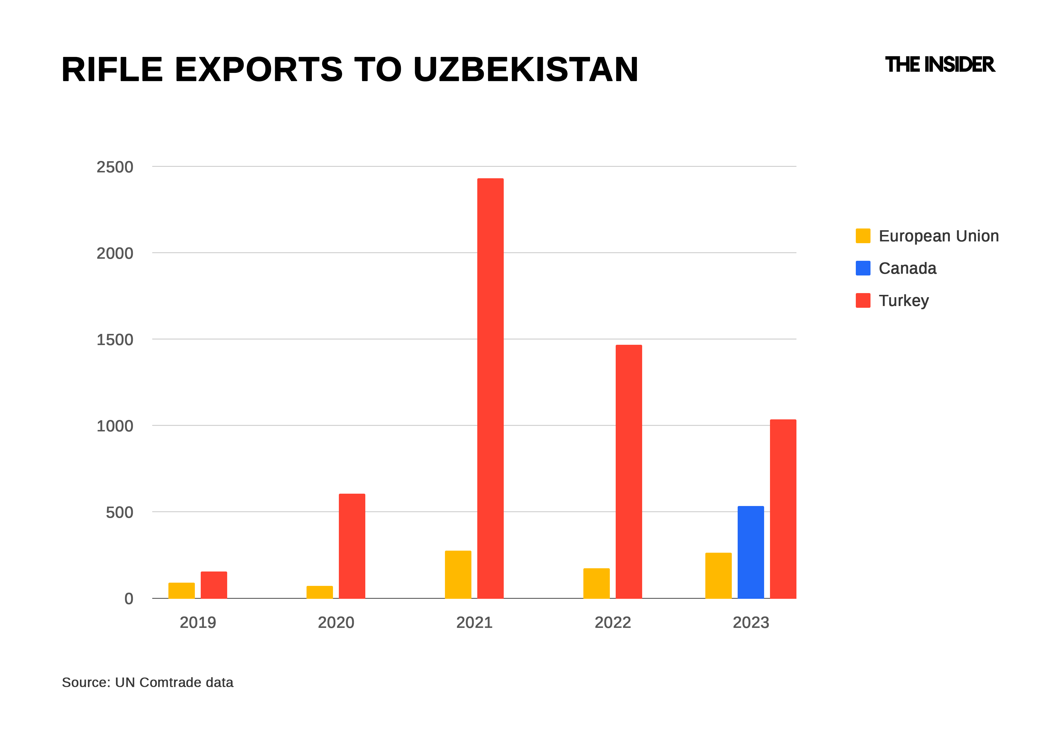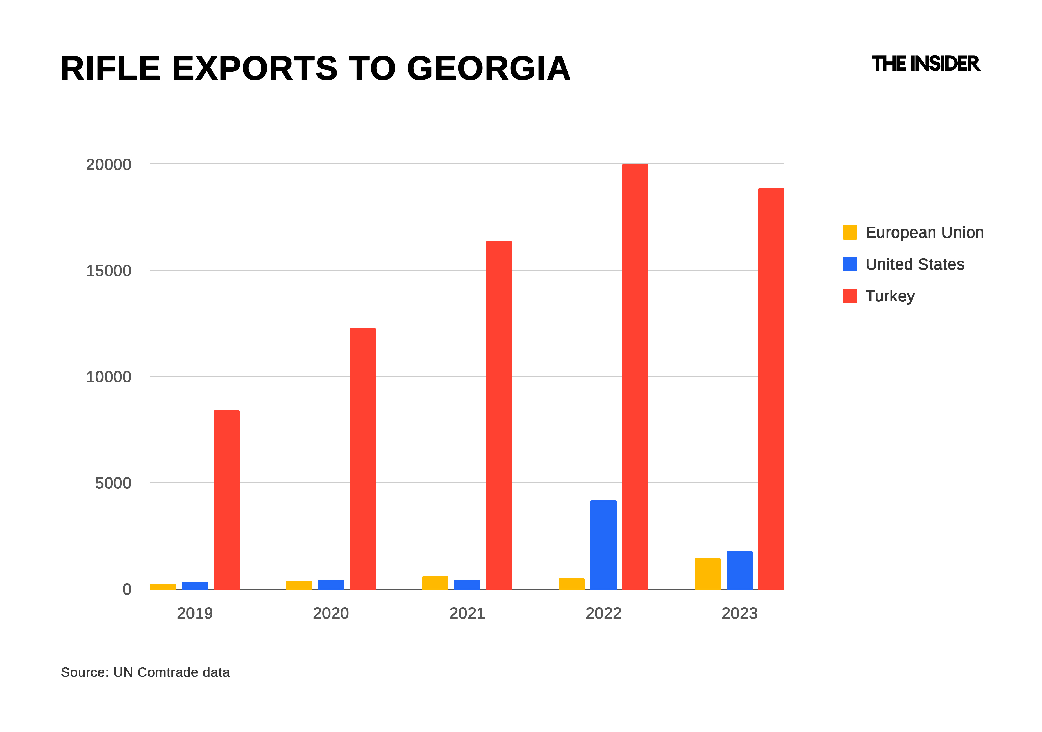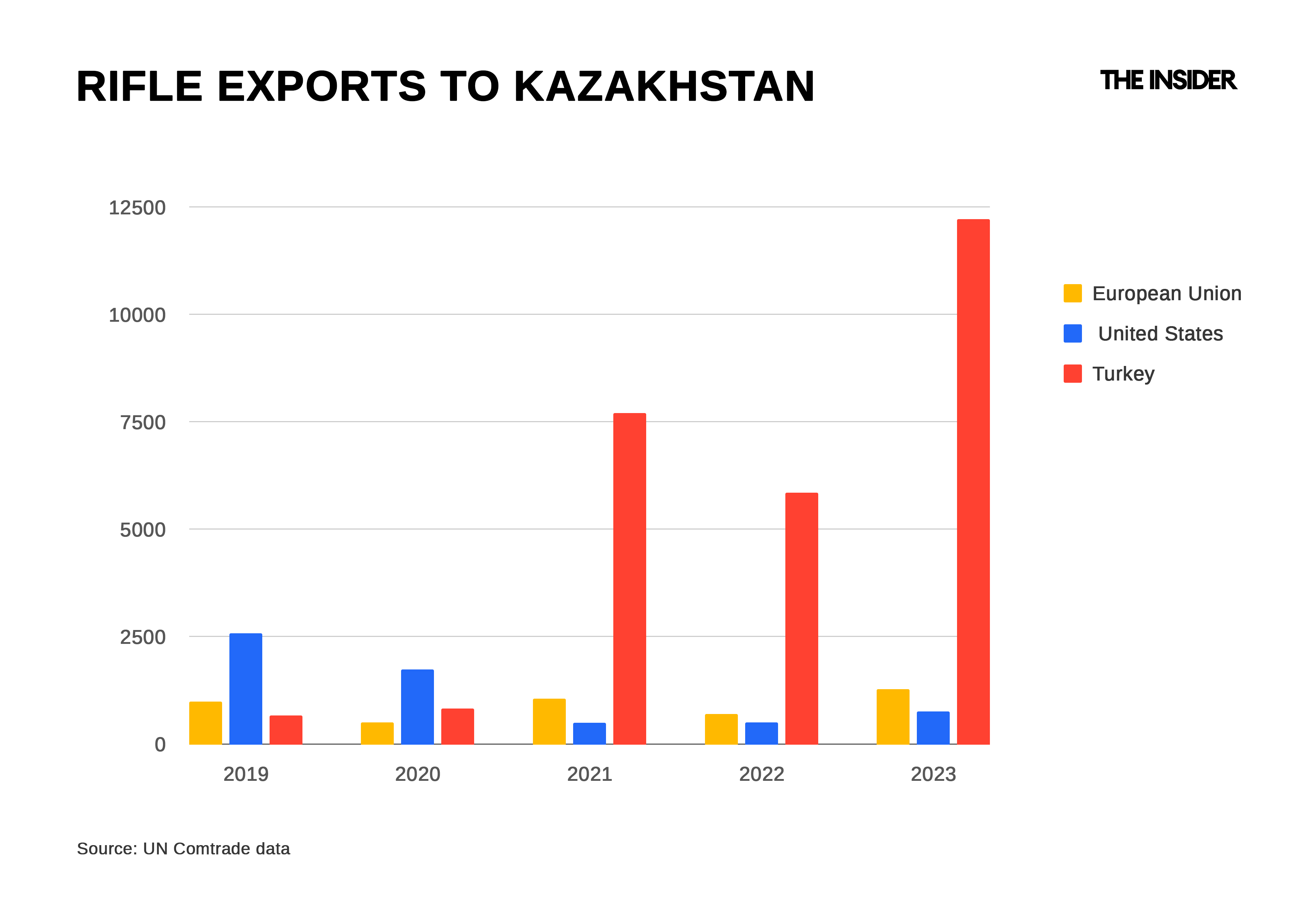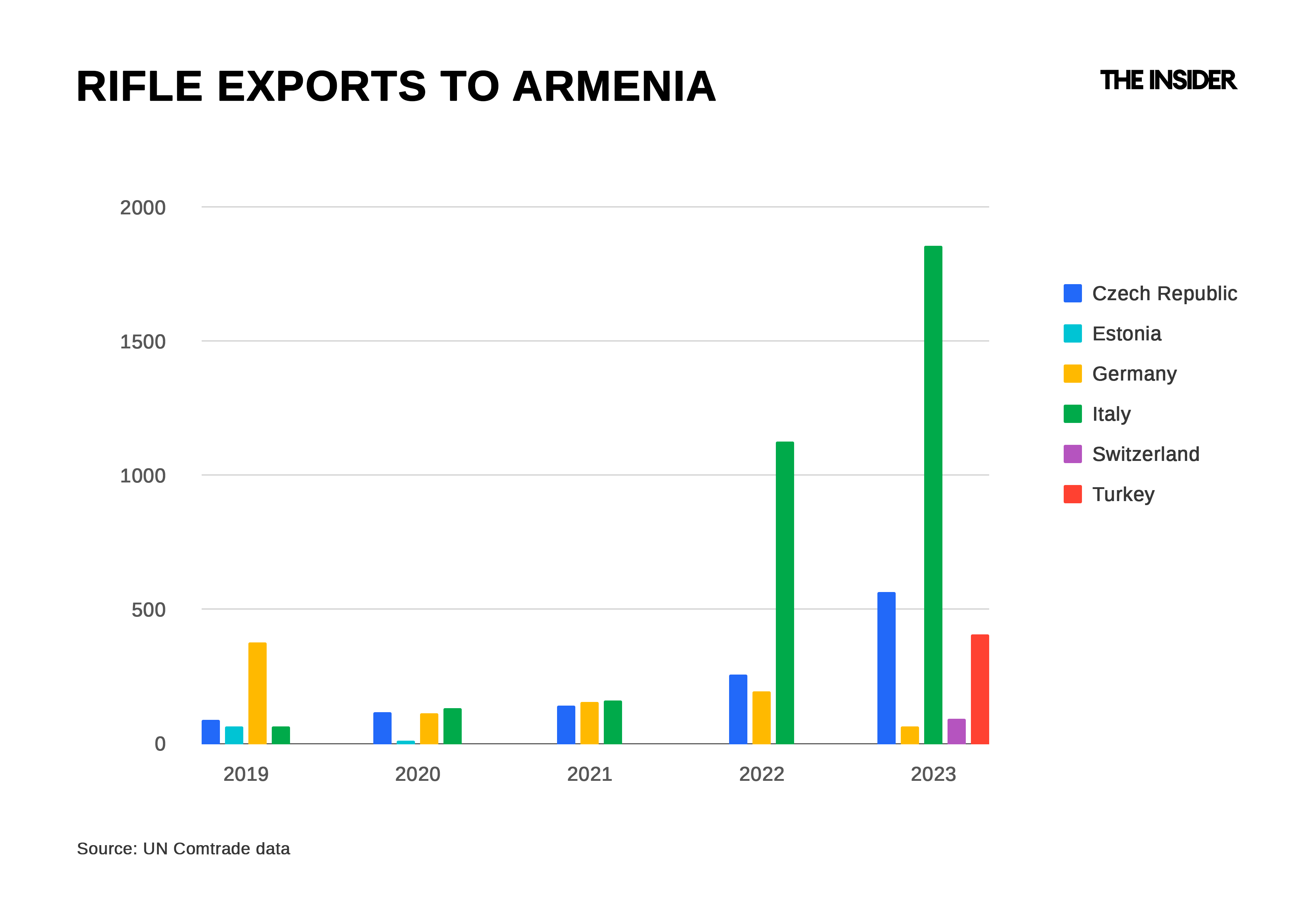 The increase in arms supplies to Russia's neighbors from the European Union, Turkey, and the United States is staggering. According to UN Comtrade data analyzed by The Insider, these countries receive tens of thousands of weapons annually. The statistical anomalies are impossible to overlook: exports to Armenia, Georgia, Kazakhstan, and Kyrgyzstan have increased two and a half times over three years, rising from 19,556 units in 2020 to 53,211 in 2023. For instance, Italy’s exports of rifles and shotguns to Armenia soared from 68 units in 2019 to 1,862 in 2023.