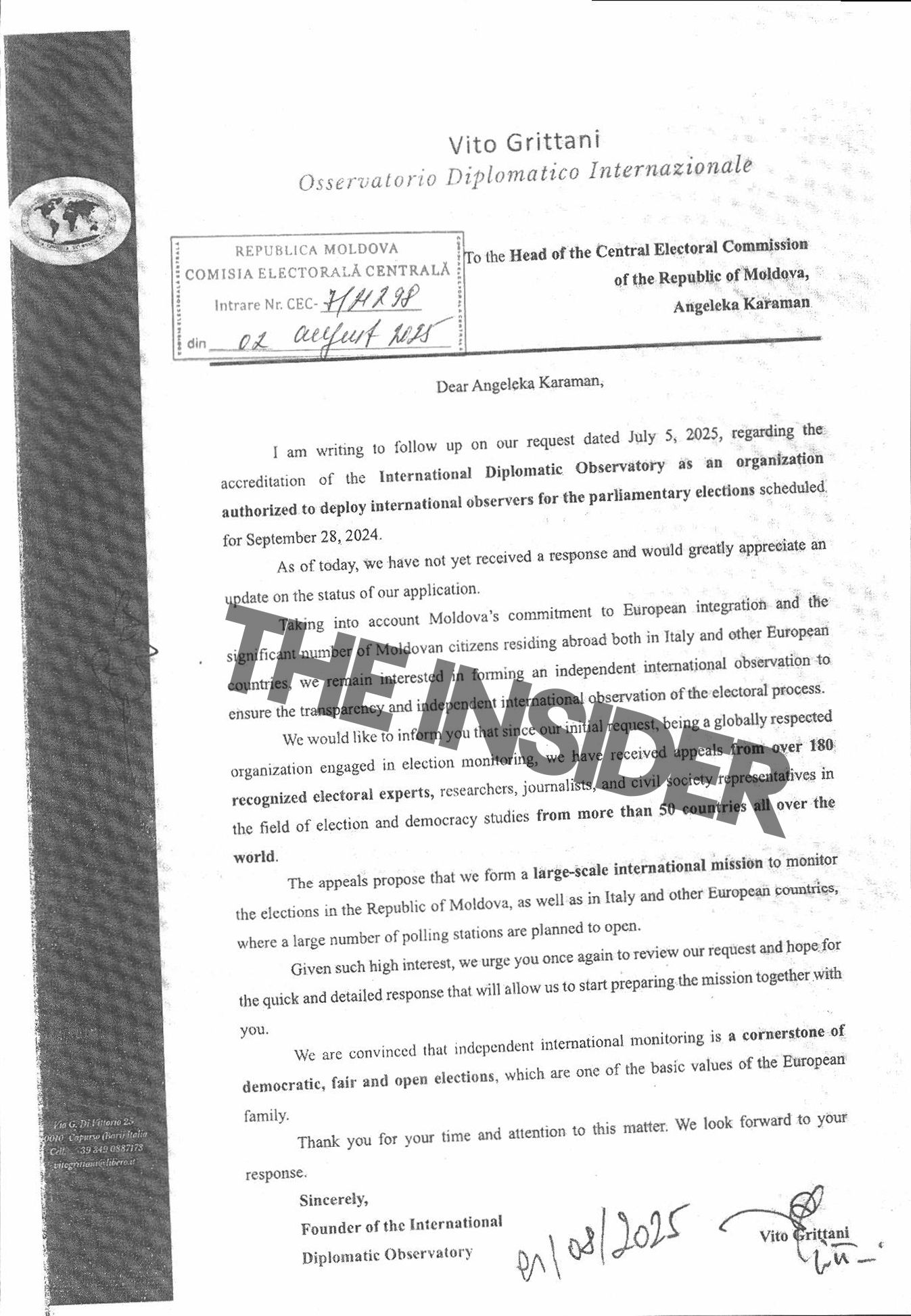 Another letter reviewed by The Insider came from Vito Grittani, founder of the International Diplomatic Observatory (Osservatorio Diplomatico Internazionale). Despite his Italian background, Grittani holds citizenship of Abkhazia, a breakaway region on the Black Sea coast, which is internationally recognized as part of Georgia but has been controlled by Russian-backed authorities since the early 1990s.