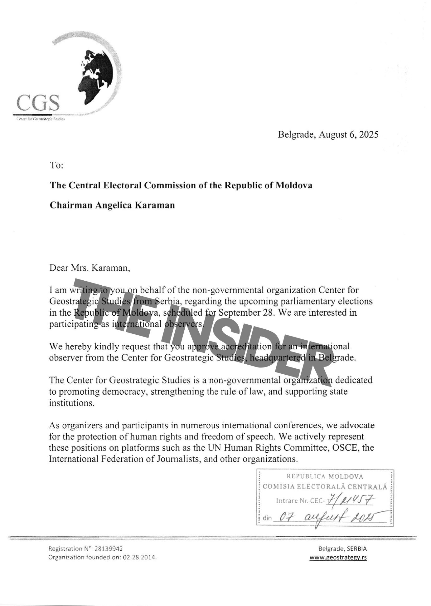 The director general of the Serbian Center for Geostrategic Studies (CGS), Dragana Trifković, was one of the individuals who requested accreditation for the elections. A letter signed by her was sent to Moldova’s Central Election Commission back on Aug. 6.