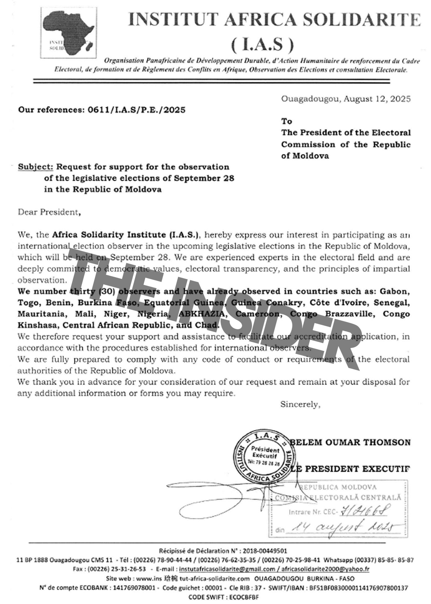 The largest group of observers — 30 people — for Moldova’s parliamentary elections was put forward by the African Institute of Solidarity (Institut Africa Solidarité, IAS). In the accreditation request letter reviewed by The Insider, the authors stressed their extensive experience as election observers in different countries: the Central African Republic, Mali, Senegal, Chad, partially recognized “Republic of Abkhazia.”