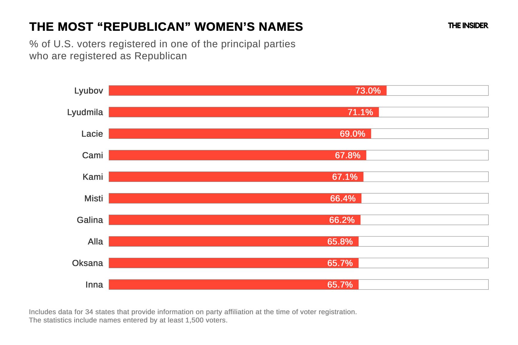 In the U.S., 58% of Cubans and 32% of other immigrants from Central and South America vote Republican. Notably, the same trend applies to immigrants from post-Soviet countries. Out of the ten female first names that tend to lean Republican by the widest margin, six are of Slavic origin.
