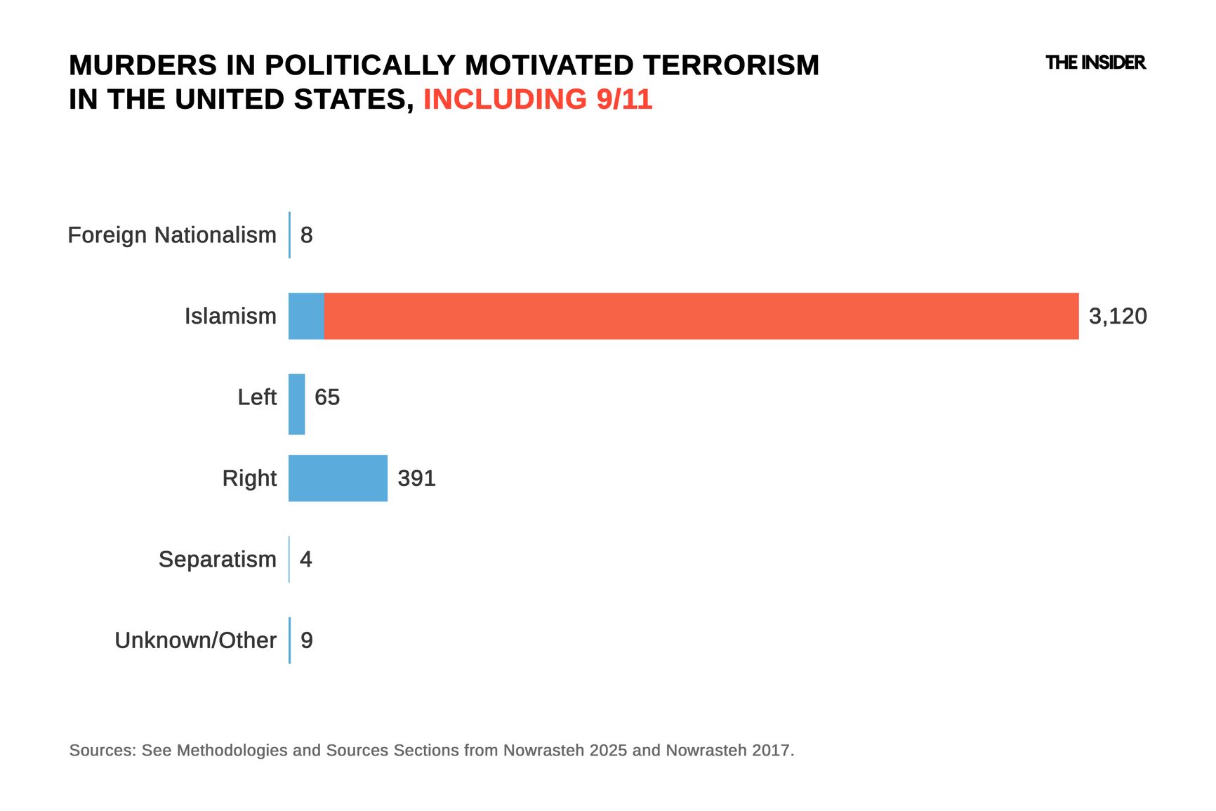 According to Cato Institute studies, Islamists are responsible for 87% of deaths in terrorist attacks within the U.S., but ultraright ideology ranks second as a motivation, accounting for 391 deaths, or 11%. At the same time, the far left has killed 65 people in attacks, representing 2% of all victims.