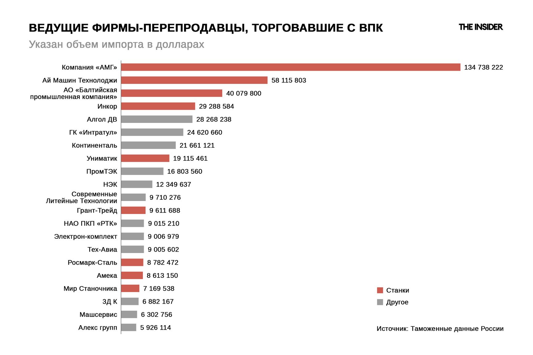 Целый ряд компаний ввозят фрезерные и токарные станки, часть которых поставляется ВПК. Среди них — «Мир Станочника», «Ай Машин Технолоджи», «АМГ», «Промсервис», Балтийская промышленная компания. О сотрудничестве некоторых из них с ВПК The Insider уже писал.