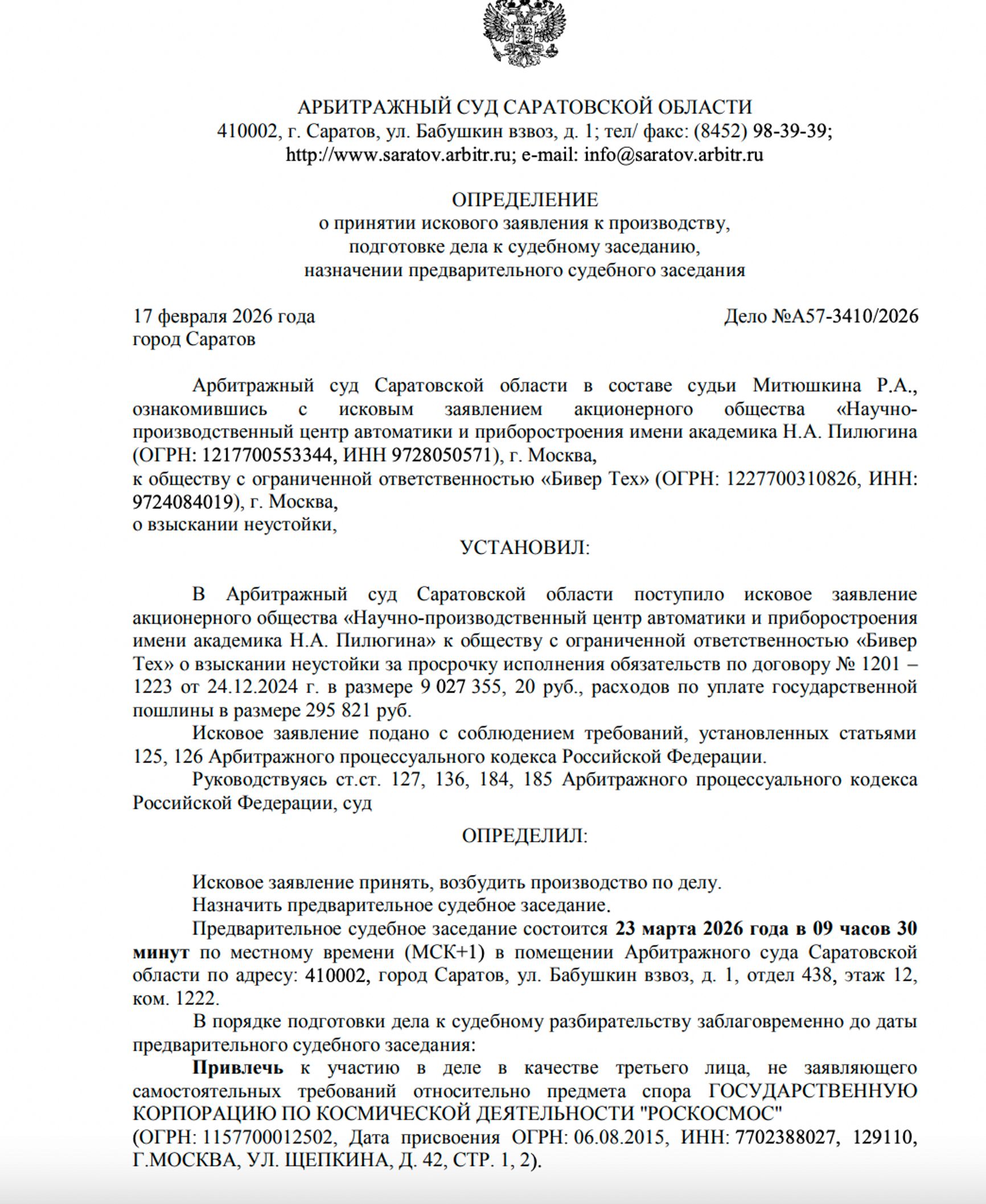 В феврале в Арбитражный суд Саратовской области поступило исковое заявление НПЦАП к «Бивер Тех», из которого следует, что между компаниями в 2024 году заключен договор. В том же году, согласно данным бухотчетности, выручка фирмы Елисеева резко выросла: с 64 млн рублей годом ранее до 296 млн.