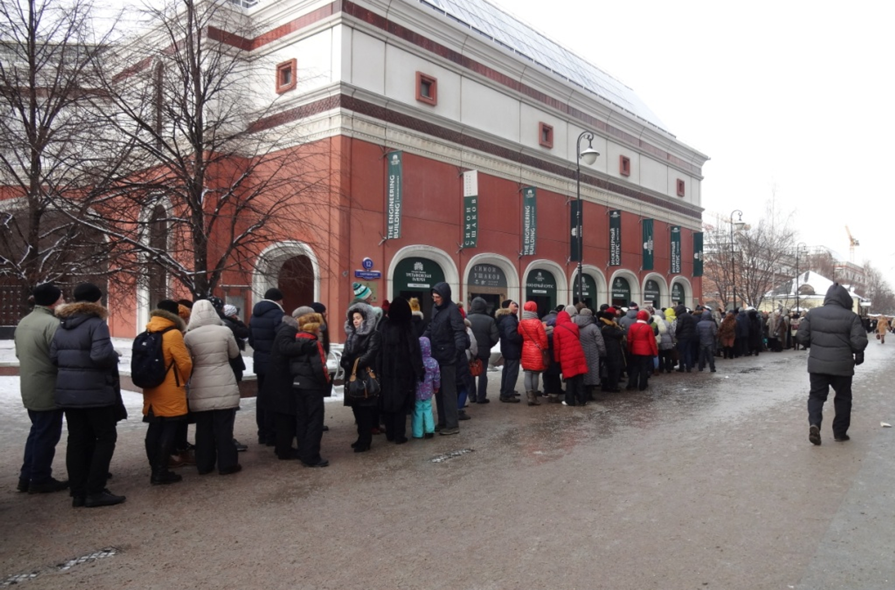 Как передает «Интерфакс», очередь растянулась до конца Лаврушинского переулка. Среди людей, желающих попасть на выставку, много молодежи.