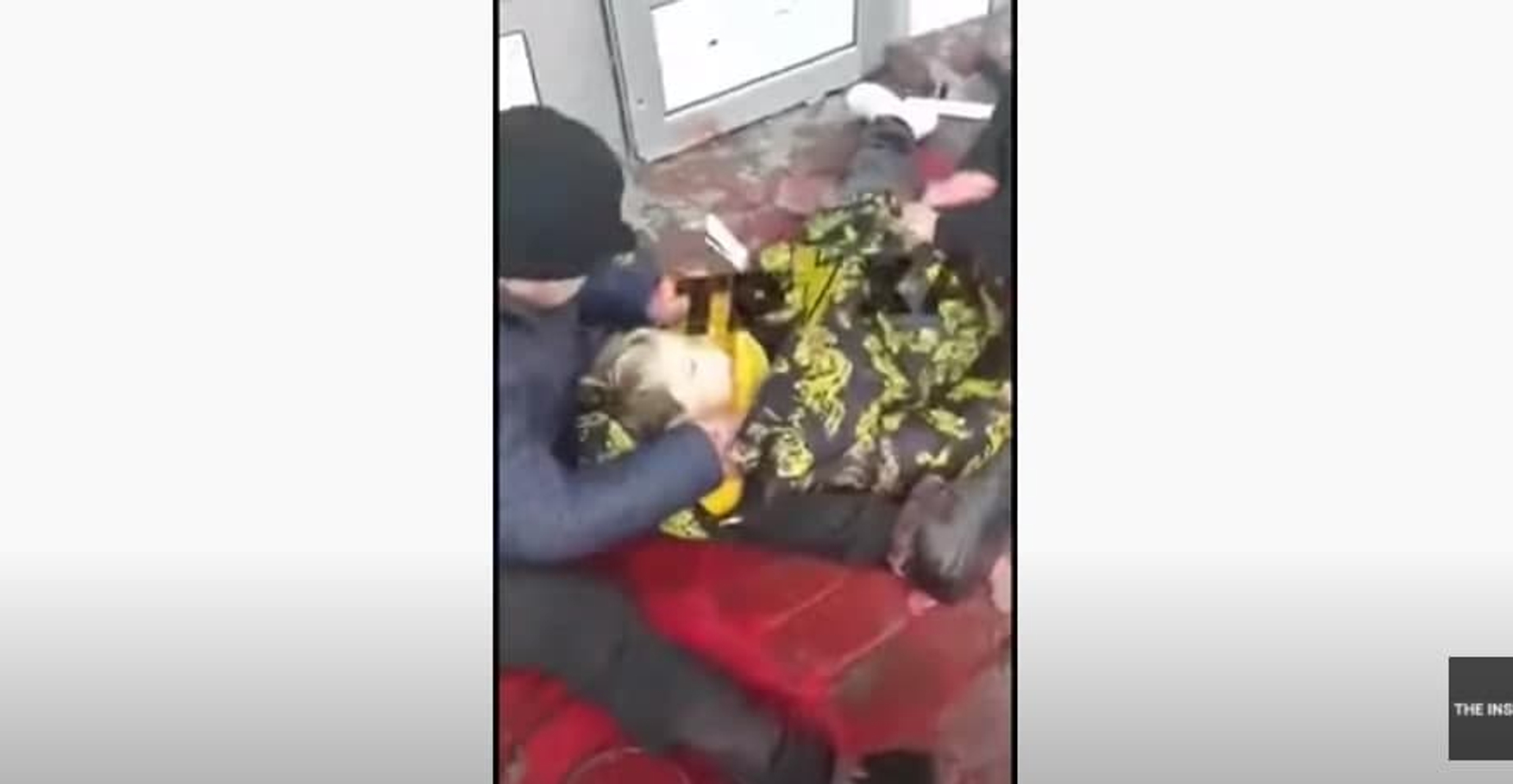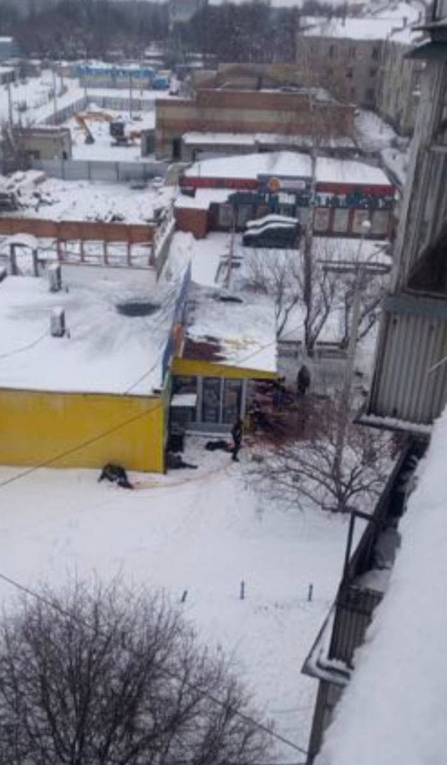 На кадрах видны люди, лежащие на земле в крови у дверей магазина. Рядом с ними лежат обломки, вероятно, от крыши или стен здания: