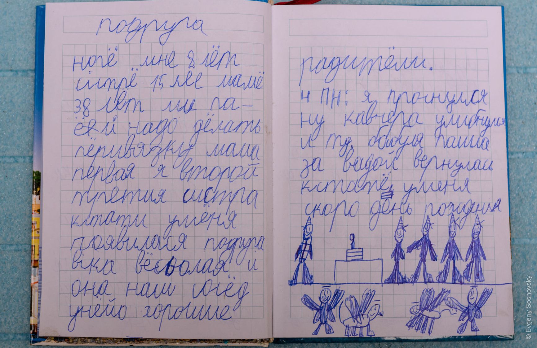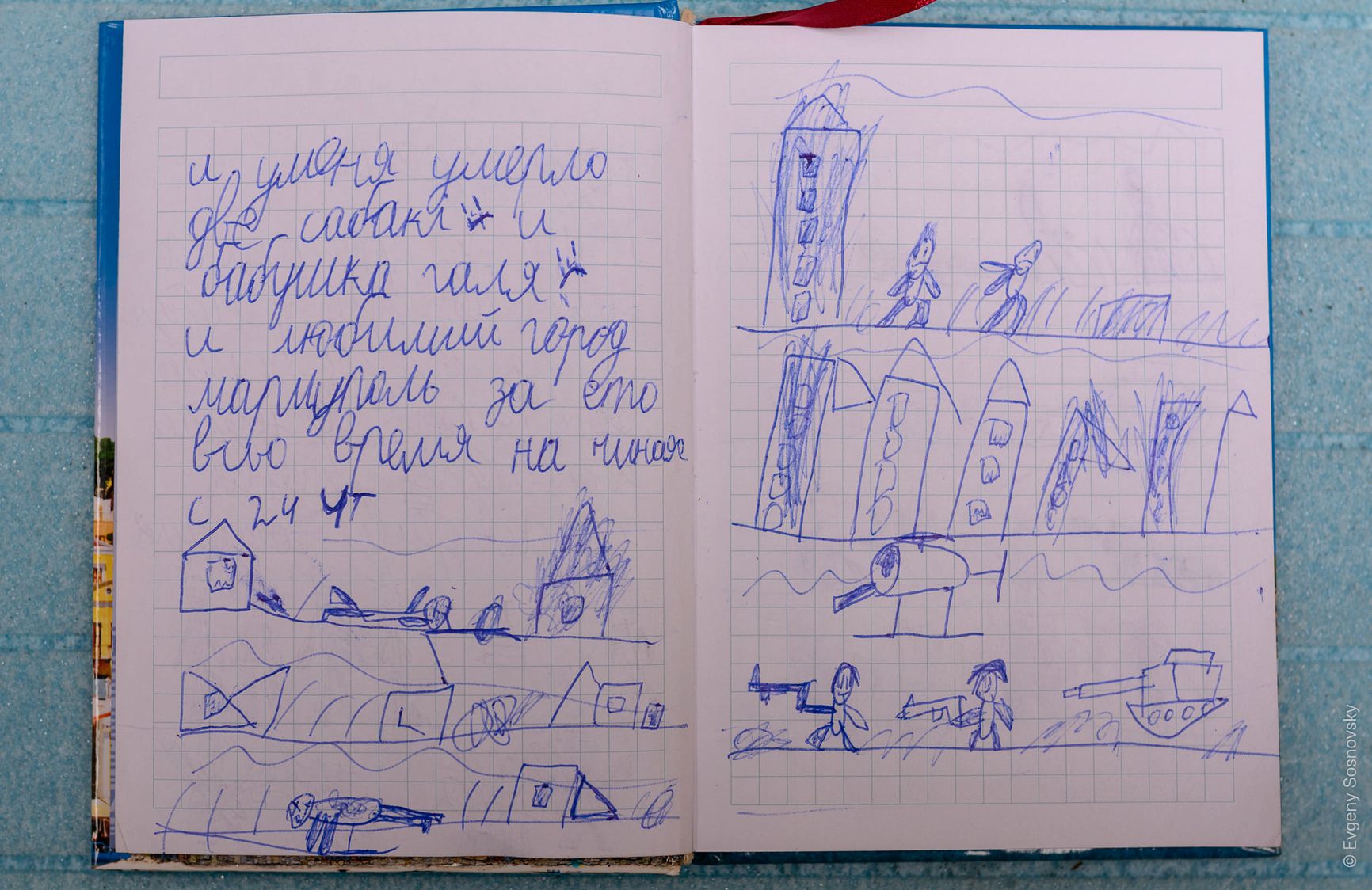 Восьмилетний житель Мариуполя написал на первой странице блокнота слово «война», а затем рассказал о гибели родственников: дедушки и бабушки. Также ребенок написал о ранениях матери и 15-летней сестры и об умерших собаках. «Я хорошо поспал, проснулся, улыбнулся, встал и почитал до 25 ст. Еще у меня умер дедушка, у меня рана на спине, выдрана кожа, сестре ранение головы, маме выдрано мясо на руке и дырка в ноге», — пишет ребенок.