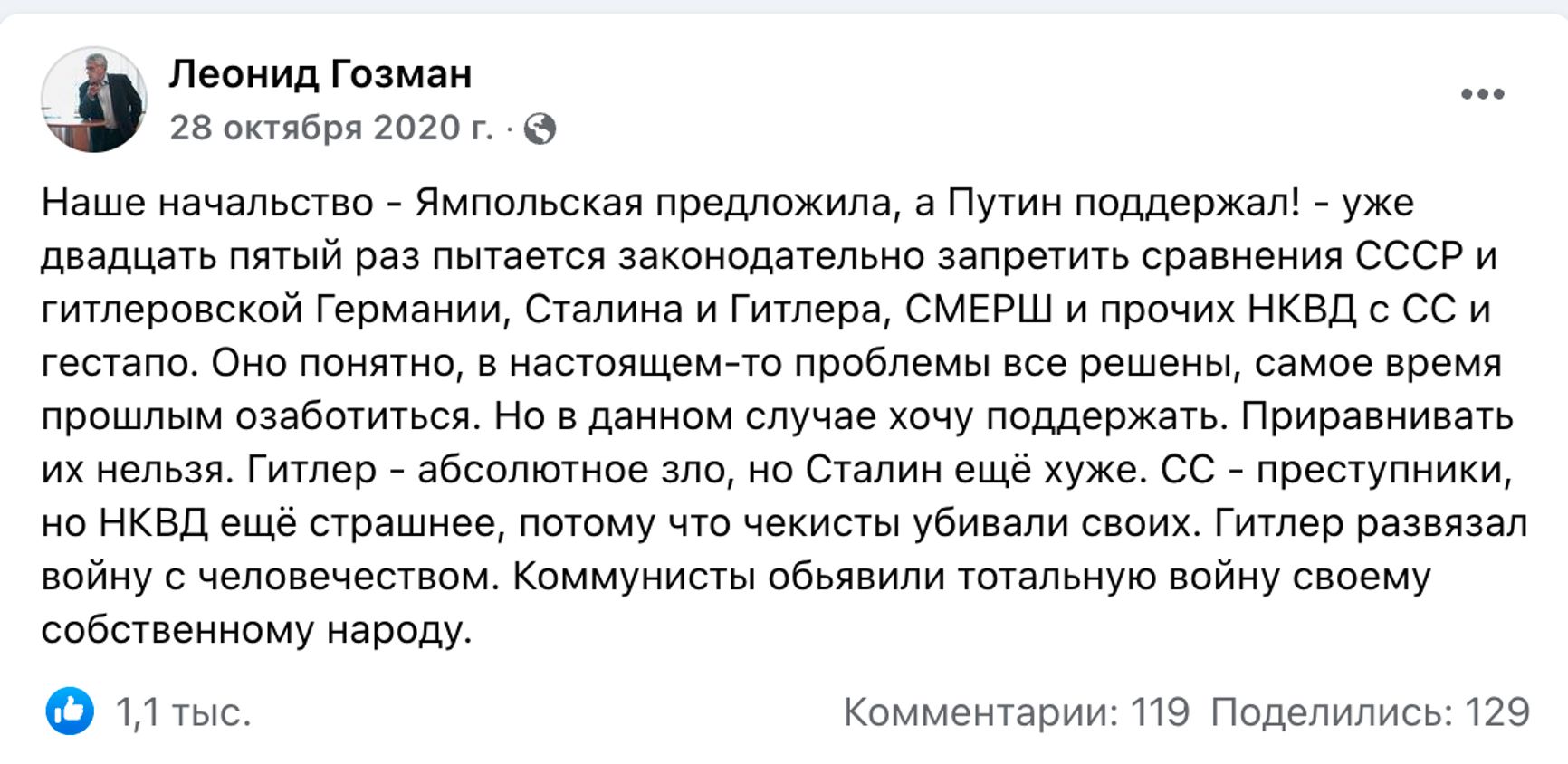 В публикации, из-за которой возбудили дело, Гозман писал, что Гитлер — абсолютное зло, но Сталин еще хуже. По словам политика, НКВД страшнее СС, «потому что чекисты убивали своих».