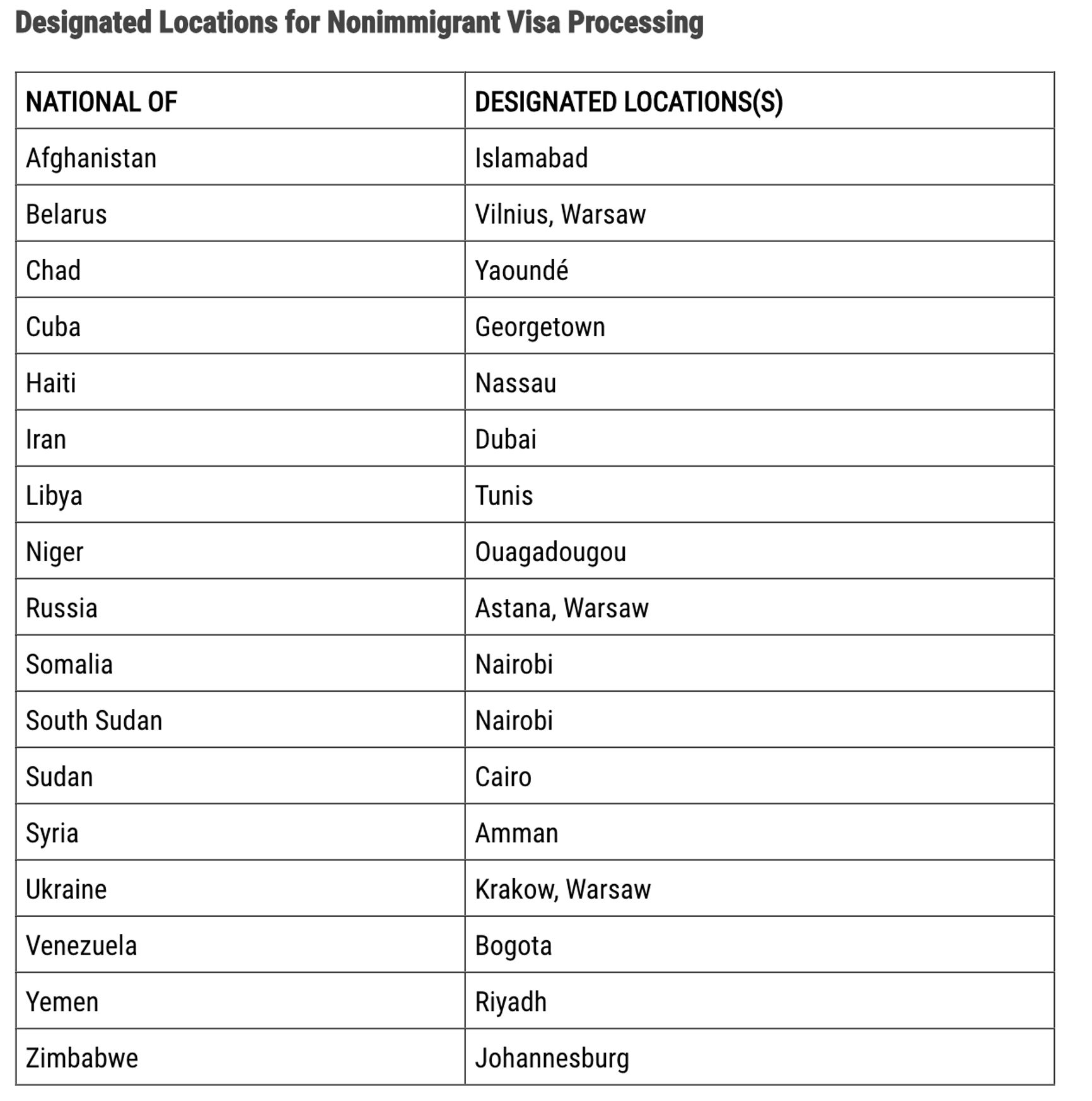 Для граждан 17 стран, включая Россию, где выдача таких виз приостановлена, США назначили определенные посольства и консульства для подачи заявлений. Граждане России могут подать документы в посольствах США в Астане и Варшаве. Если заявление подается по месту фактического проживания, заявитель обязан предоставить доказательства проживания в этой стране.