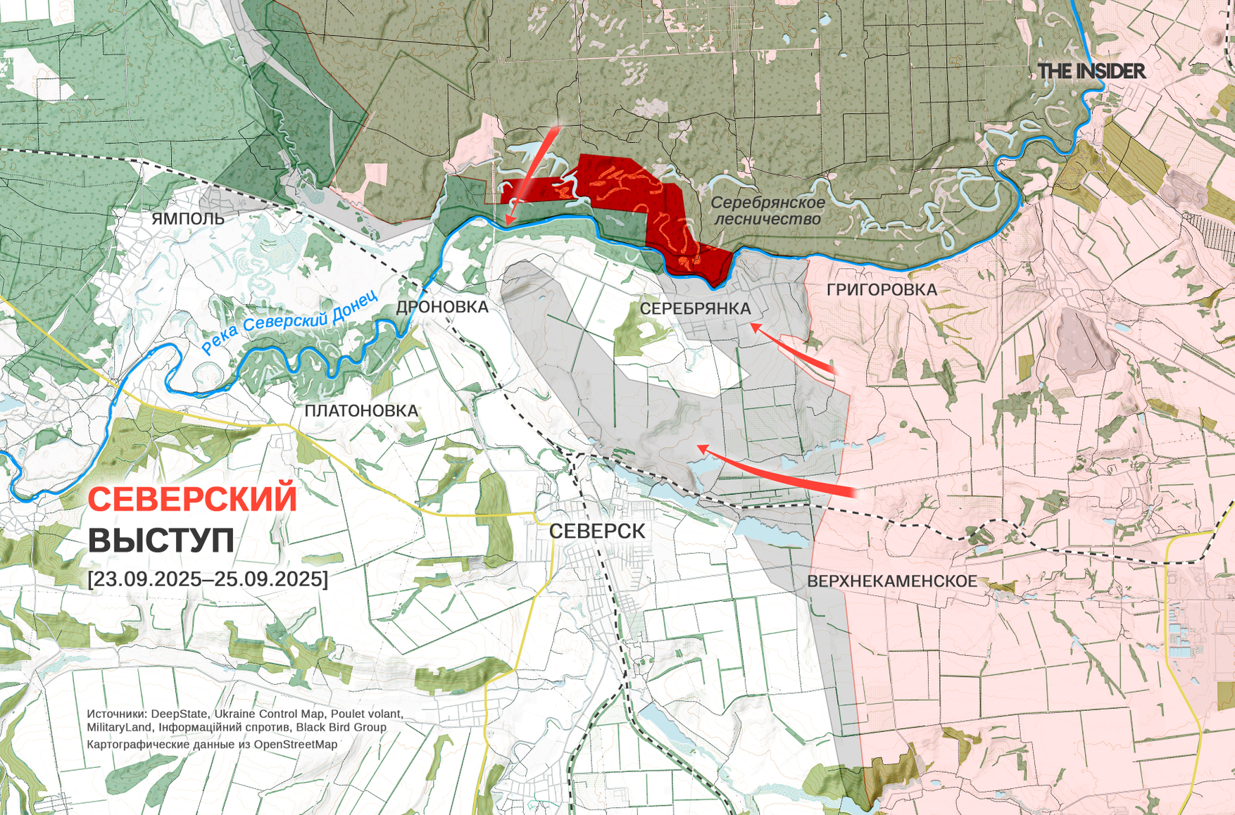 DeepState сообщает, что ВС РФ продвинулись в Серебрянском лесничестве на стыке лиманского направления и Северского выступа. Согласно карте проекта, российские военные вышли к реке Северский Донец к северу от Серебрянки.