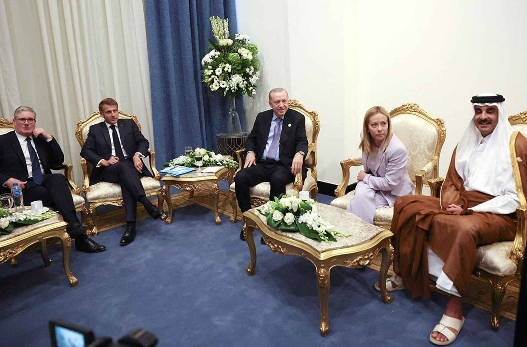 Кир Стармер, Эммануэль Макрон, Реджеп Тайип Эрдоган, Джорджия Мелони и Тамим бин Хамад Аль Тани встретились в Шарм-эш-Шейхе (Египет) 13 октября 2025 года накануне саммита мировых лидеров, посвящённого прекращению войны в Газе. (Фото: Suzanne Plunkett / Getty Images)