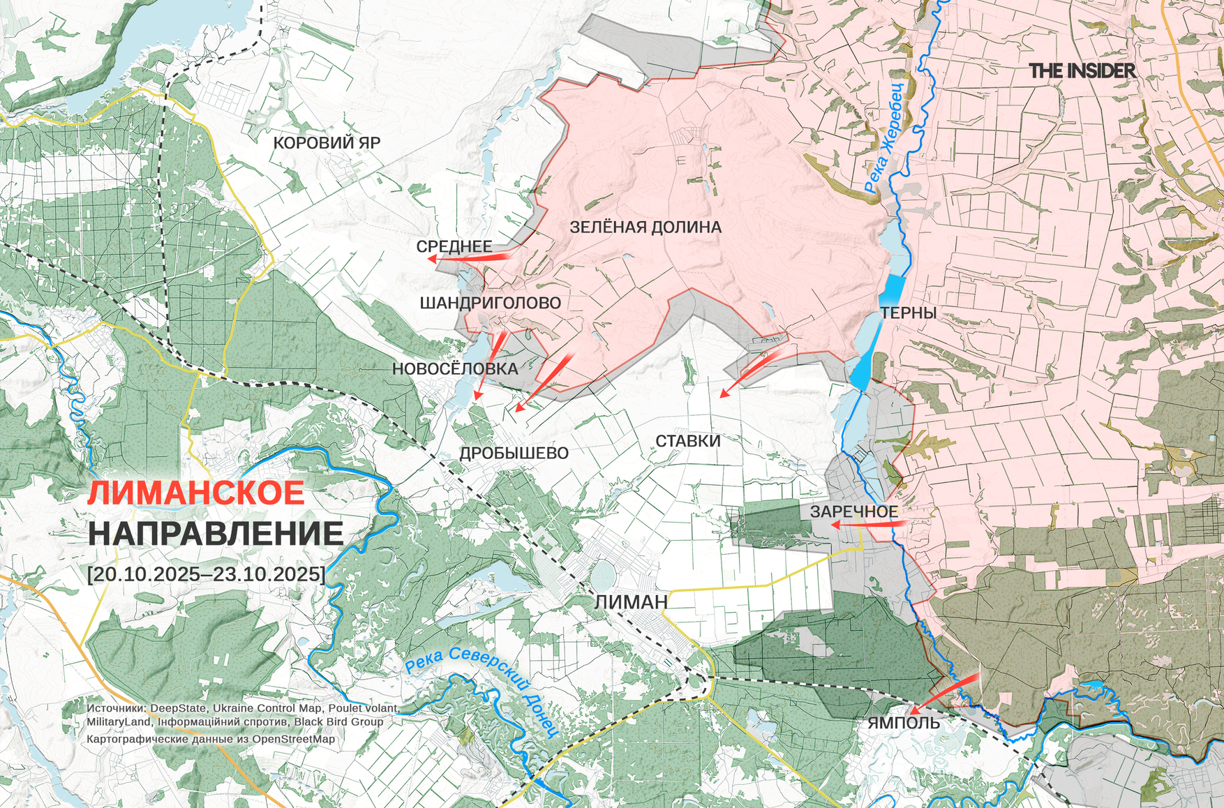 Как пишут аналитики DeepState, российские войска продолжают «инфильтрацию» в лесах в треугольнике населенных пунктов Ямполь — Лиман — Заречное (до 2016 года — Кировск), используя преимущественно пехоту для «просачивания» вглубь территории и закрепления на определенных точках. Отмечается превосходство ВС РФ в количестве и активности авиации, а также нехватка личного состава СОУ для плотного контроля позиций. В проекте предупреждают, что в скором времени может начаться штурм Лимана.